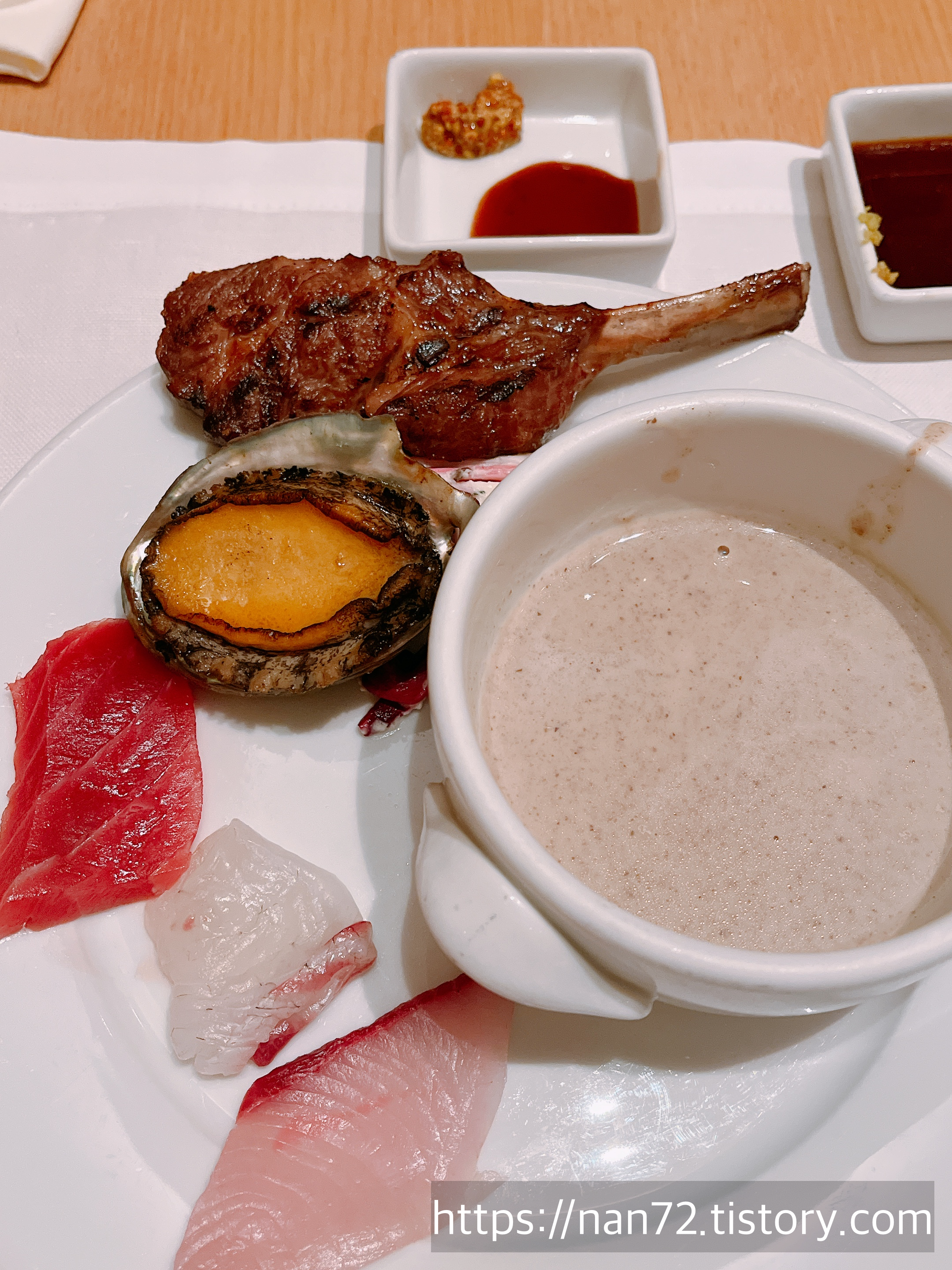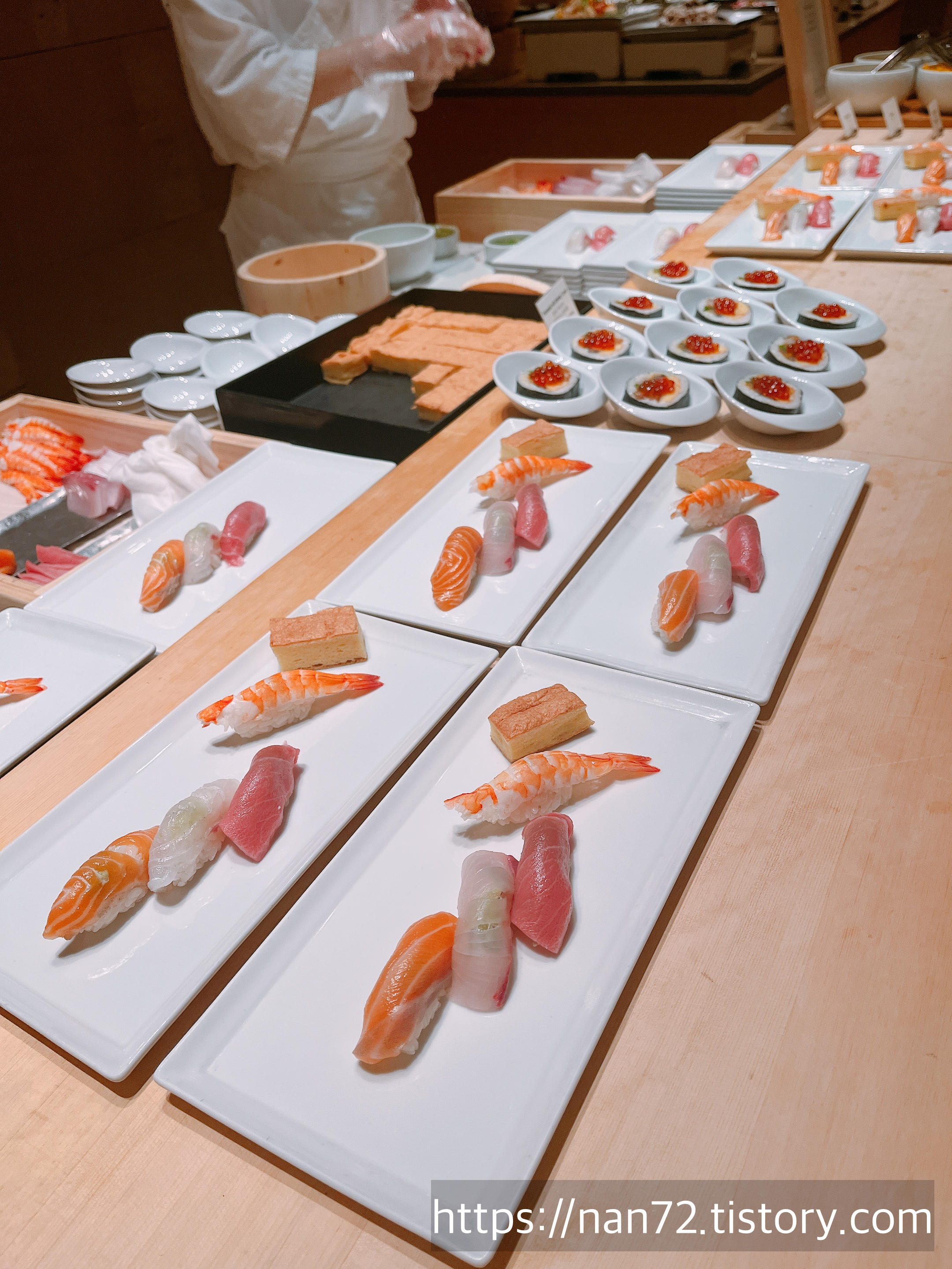 스테이크 다음 타자로 잡은 건 바로 일식입니다. 평소에도 일식 좋아해서 달려(?)갔죠. 기대했던 것만큼 온갖 종류의 회가 있던 건 아니었지만 하나하나 신선하고 맛있었어요. 저 새우초밥 옆에 있는 카스테라같이 생긴 건 계란인데 진짜 폭신폭신한 게 딱 일본에서 초밥 잘하는 집이 내주는 계란초밥에 올라가는 계란맛인 거예요. 저 식감의 계란 잘하는 곳 은근 드물어서 좀 감동했다는 TMI...🤣