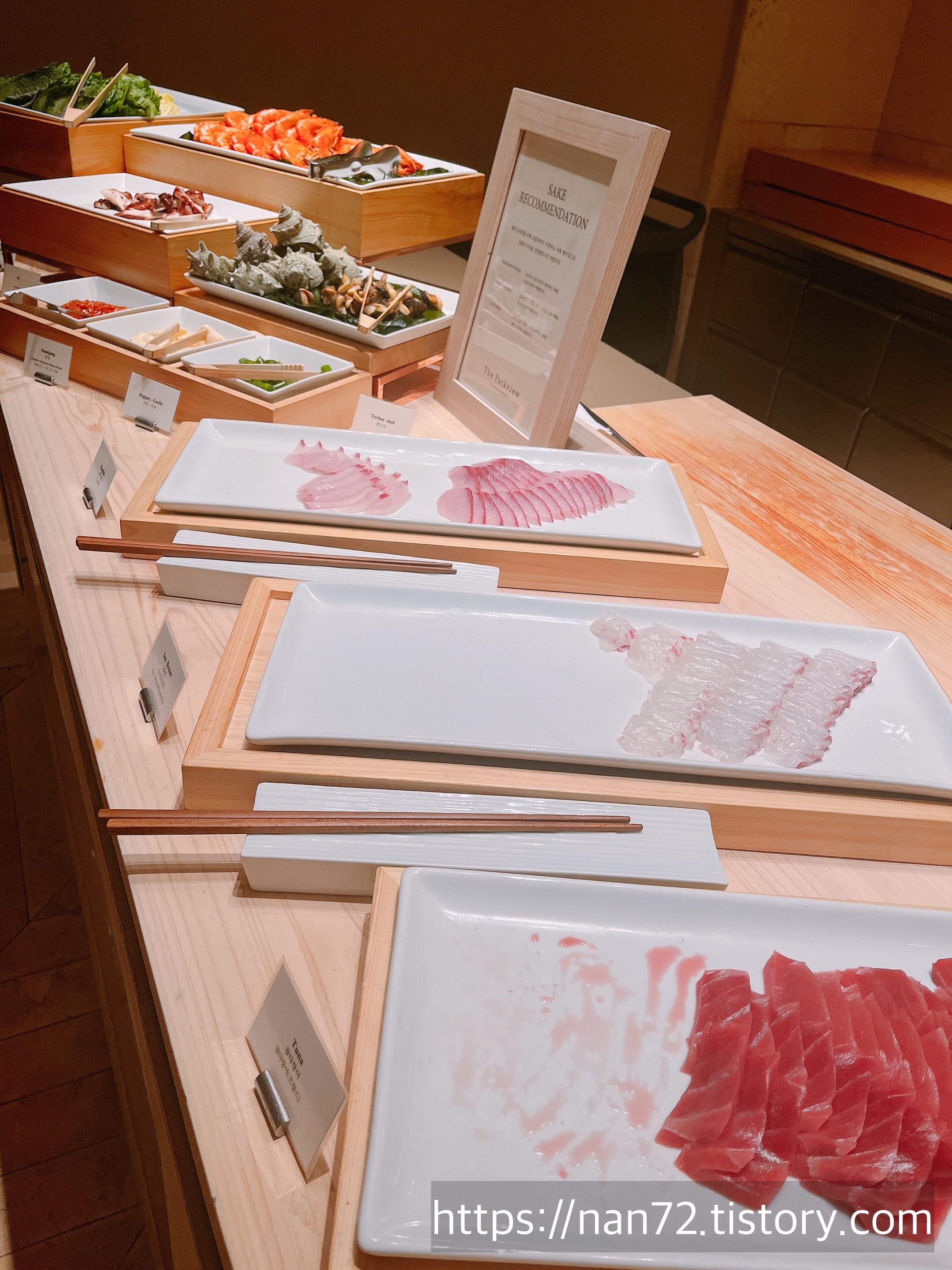 제주신라호텔은 라운지가 6층에 있는데 그 라운지에서 아래로 이어지는 계단 따라 내려가면 바로 식당코너가 나와요. 신라호텔이 자랑하는 뷔페가 있는 <더 파크뷰>, 한식전문점 <천지>, 일식전문점 <히노데>. 아쉽게도 천지와 히노데는 이번에 못 가봤네요. 다음을 기약하며 파크뷰를 열심히 즐겼답니다😋