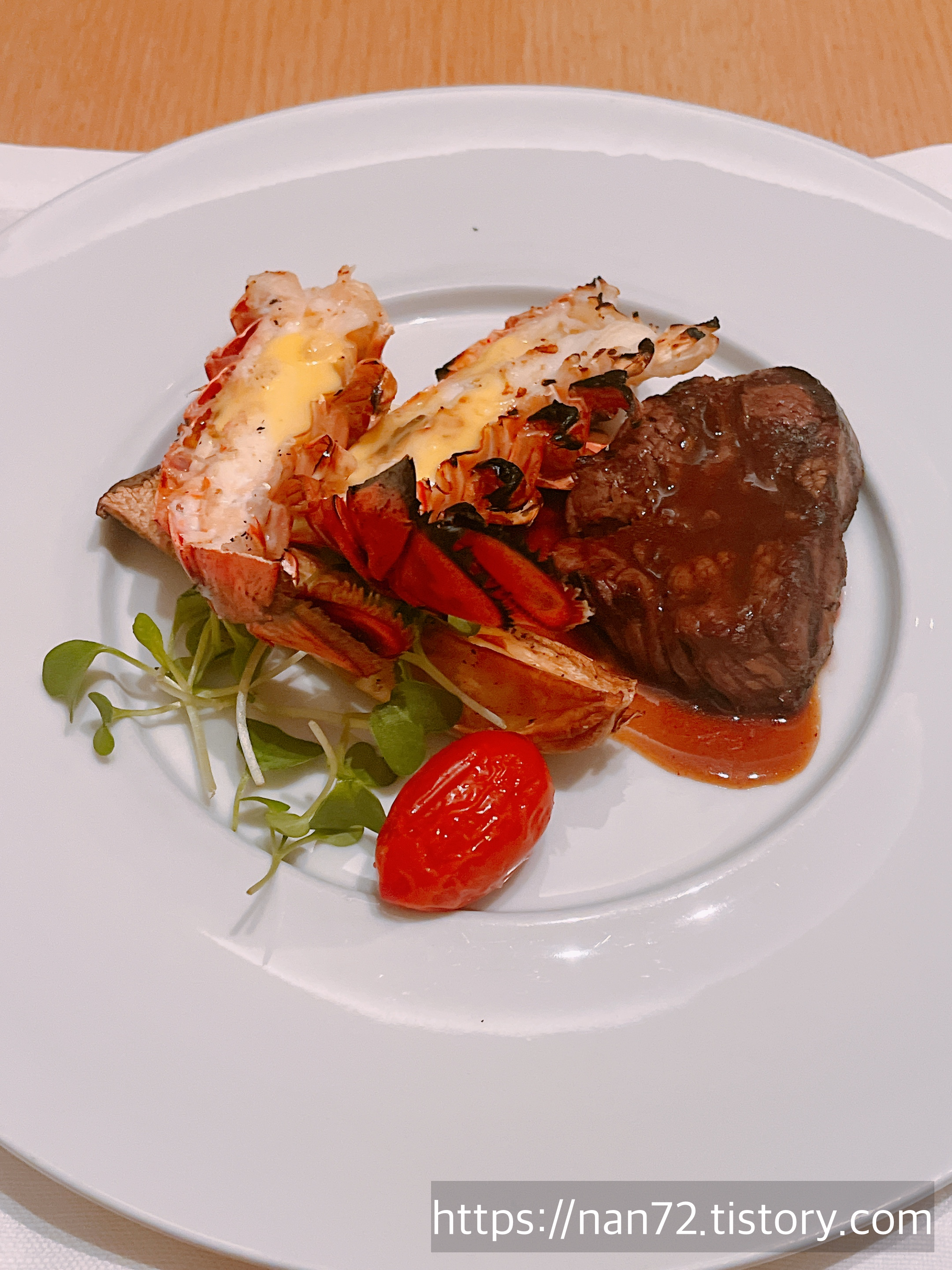 적힌 설명으로는 '아카시아꽃, 살구, 감귤과 같은 잘 익은 과일향과 신선한 산도가 어우러진 프랑스 부르고뉴 화이트 와인'이라고 소개되어 있어서 달면 무거운 요리랑 먹기엔 좀 안 어울릴 텐데... 하고 걱정했는데 막상 마셔보니 전혀 달지 않더라구요. 아니 레드와인에 비하면 달다고 할 수 있는데 디저트 와인처럼 달짝지근한 맛은 아니라 고기나 생선요리 같은 무거운 요리와 먹기에 딱 좋았어요. 사실 요 친구 덕분에 디너를 더 알차게 먹었다고 할 수 있죠.