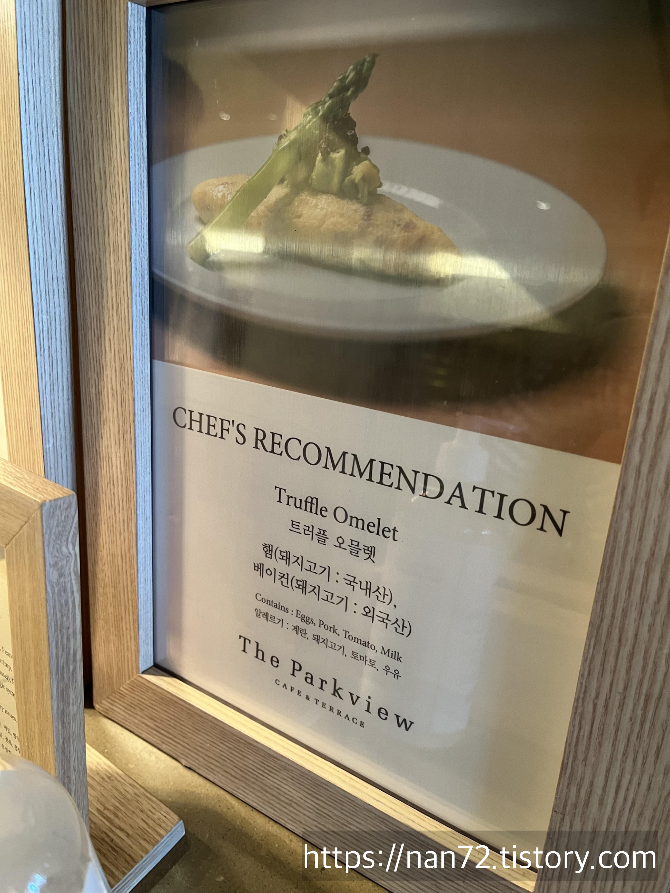조식의 특이점 중 하나. 오믈렛. 트러플이 끼얹어진 오믈렛이에요. 셰프님이 바로 앞에서 직접 만들어주시는데 약간 기다려야 하긴 하지만 갓 만든 따끈따끈한 오믈렛을 바로 먹을 수 있다는 장점 앞에선 충분히 감수할 만하죠.