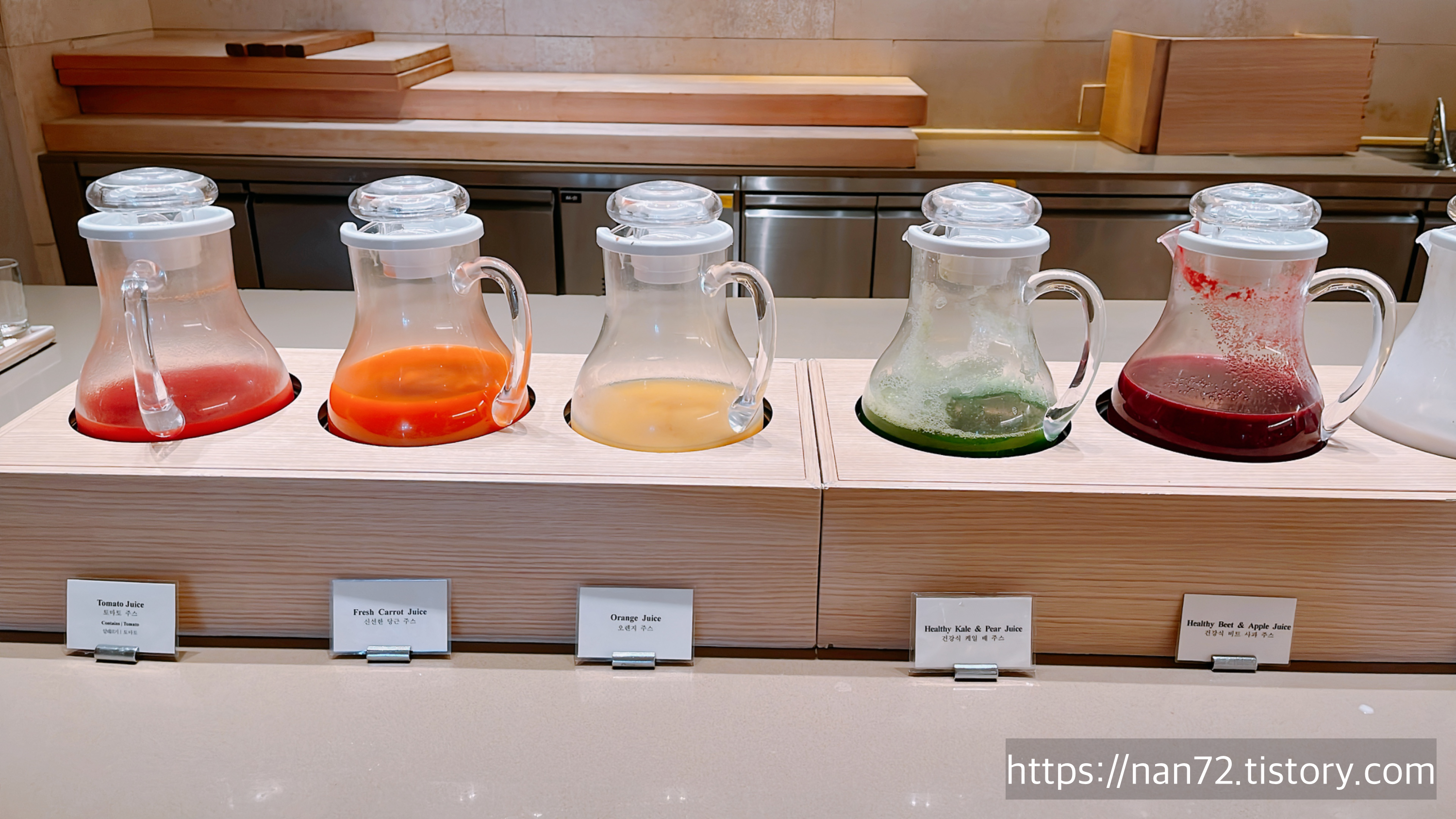 디너랑 다른 점 찾는 것도 은근 쏠쏠한 재미인데 이것도 그래요. 건강식 주스가 종류별로 놓여 있다는 점? 딱 런치스럽다 싶었어요. 저녁에 이런 건강 주스는 잘 안 먹고 아무래도 음주를 즐기는 편이니까(이하략)(매우 편파적인 발언)