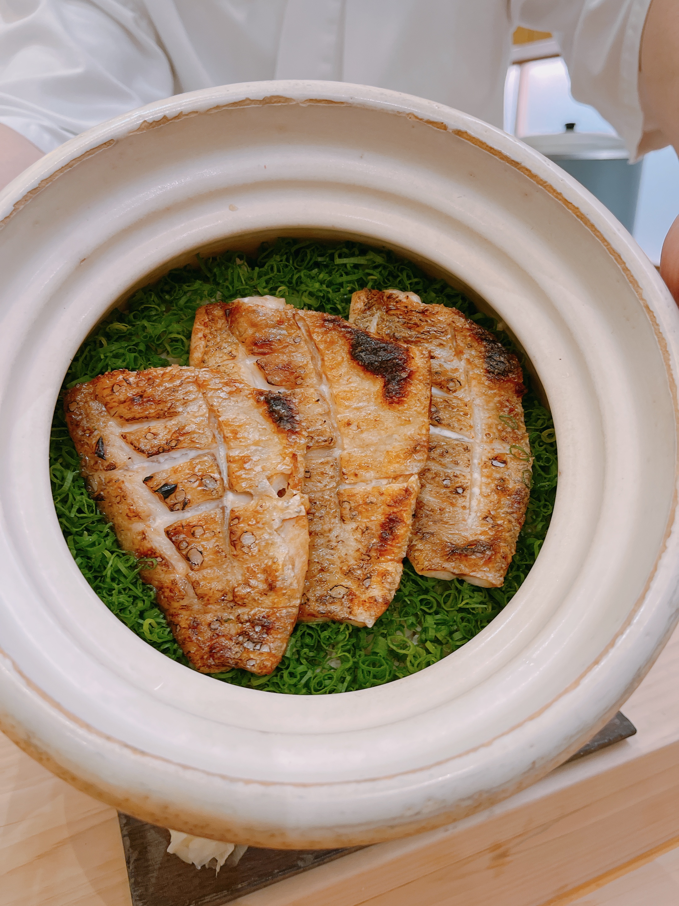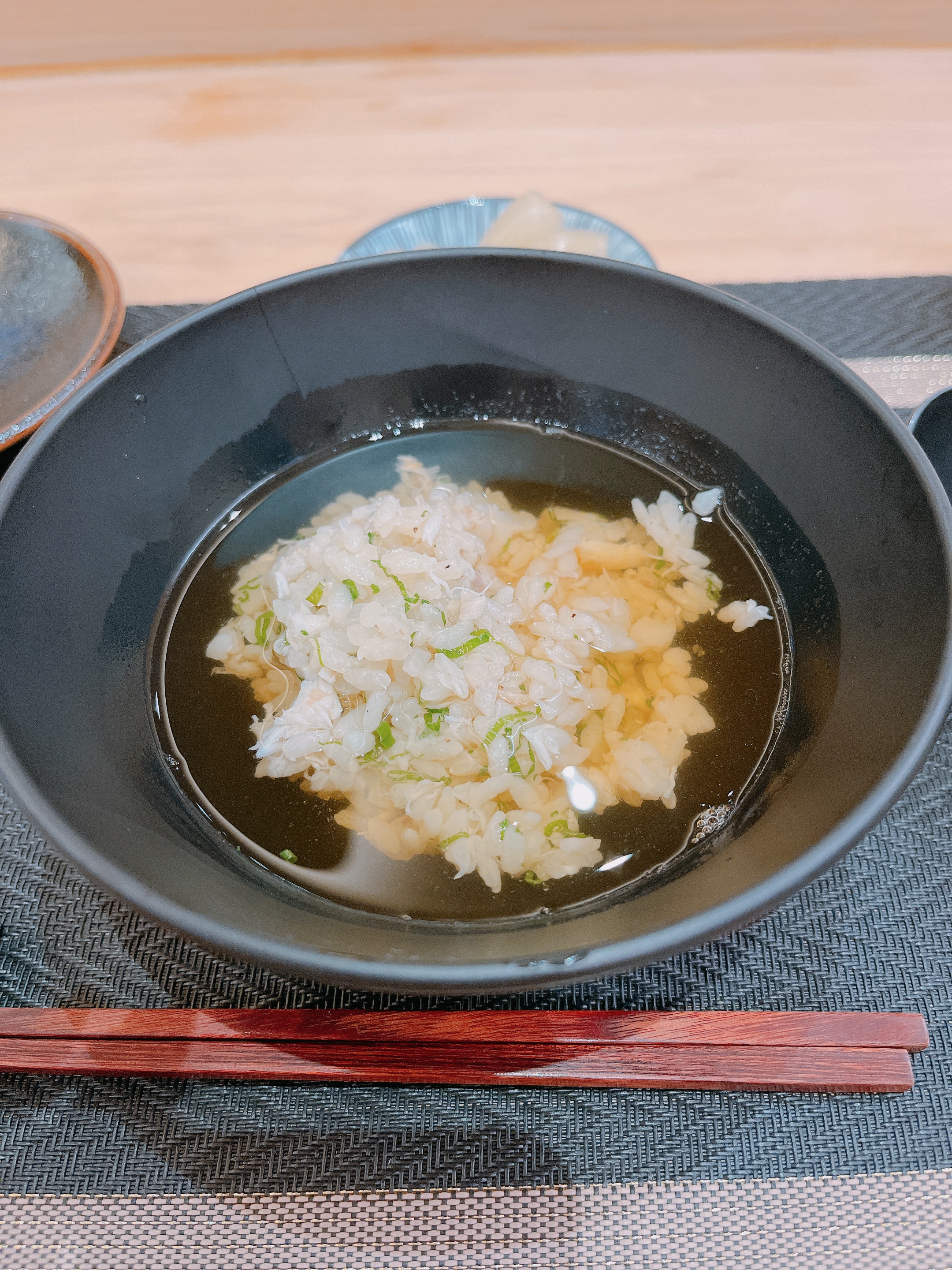 금태솥밥 오챠즈케. 첫 번째 사진은 오챠즈케로 하기 전의 완성된 모습을 사진 찍으라고 보여주신 거고 두 번째 사진이 저희에게 나온 거. 슬슬 배불러 지친 혀와 위장에 들어가기 편하게끔 순한 맛이라 좋았어요.