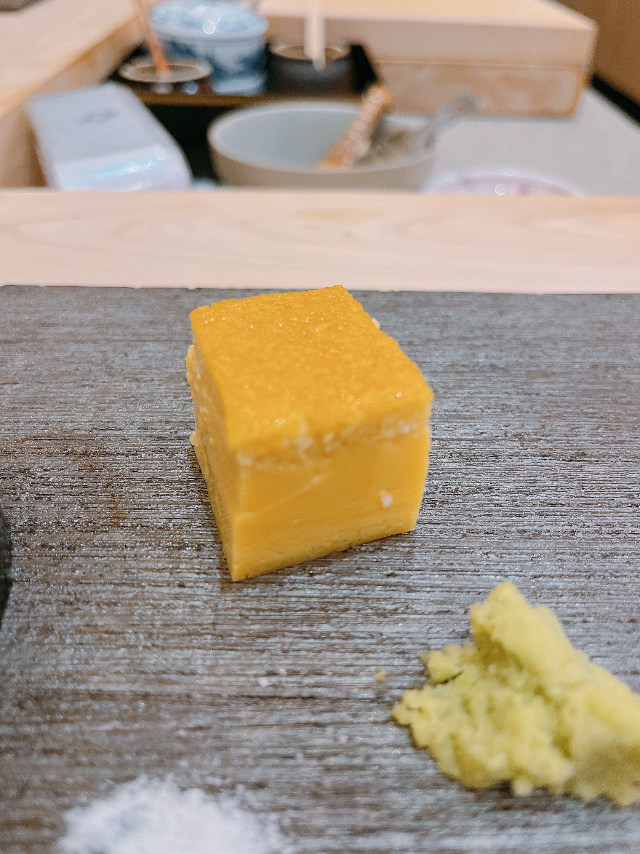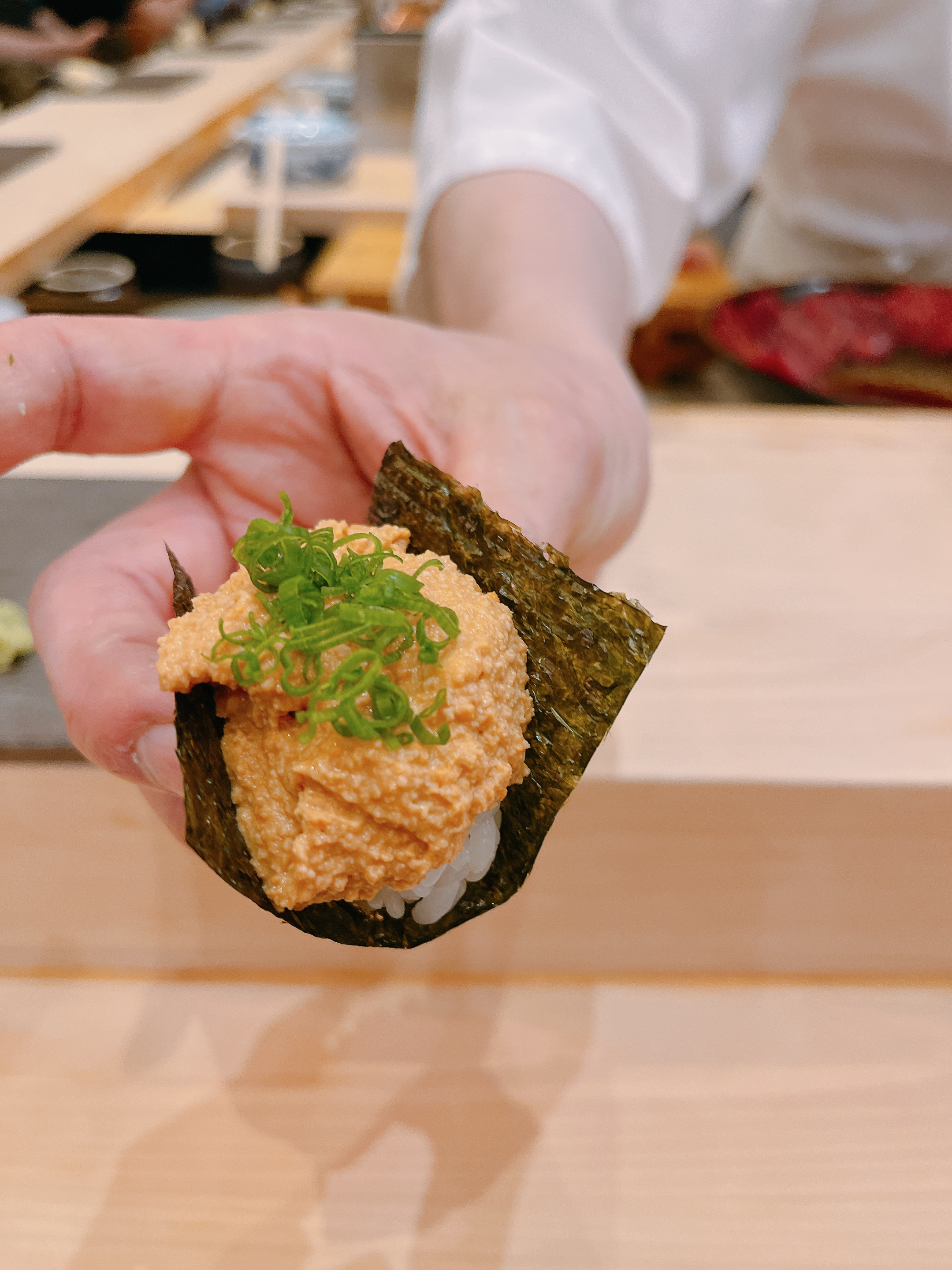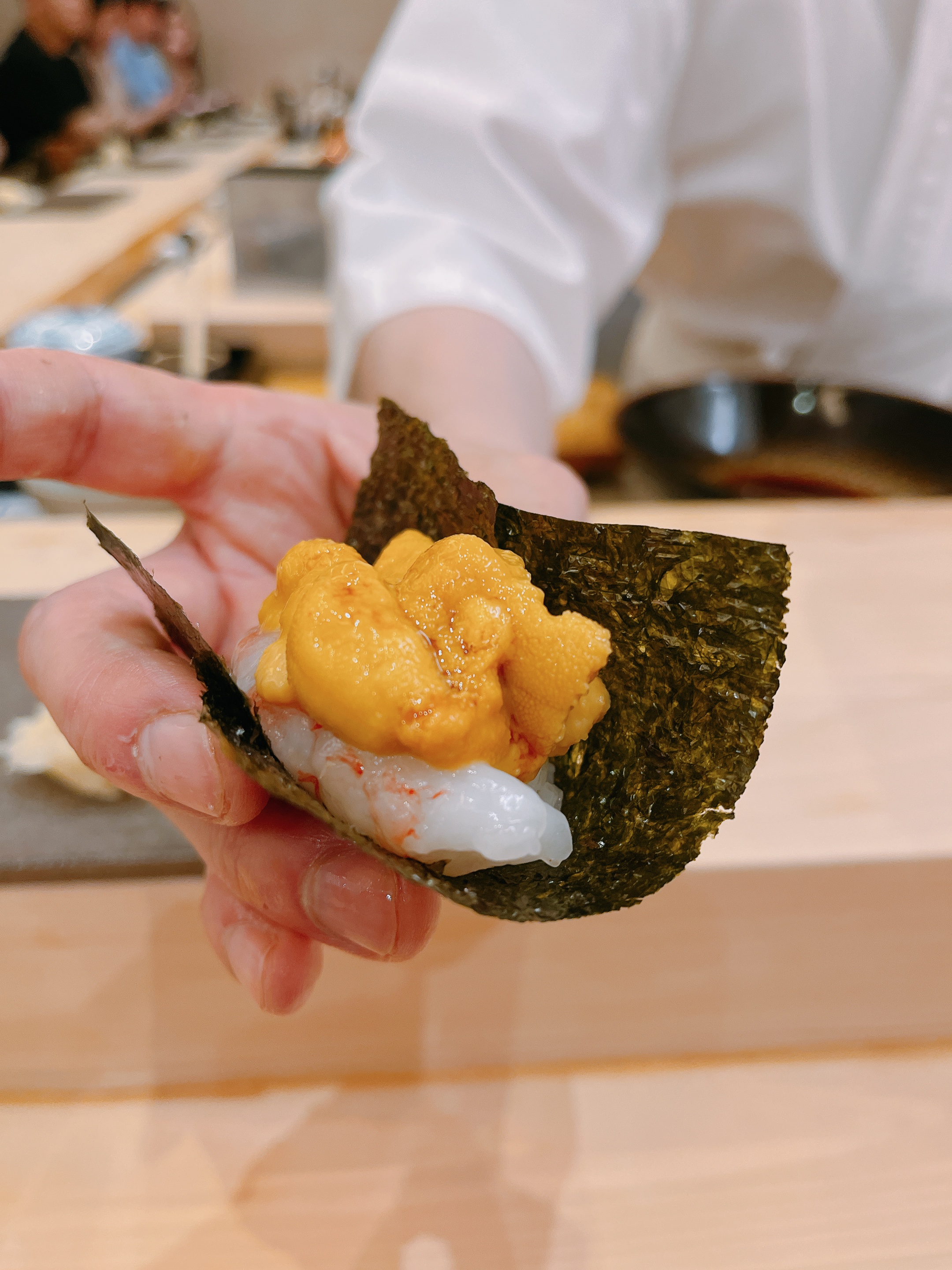 가리비 관자 위에 우니(성게알)와 생크림을 얹은 김말이. 우니와 생크림의 조합은 생소했는데 생각보다 훨씬 좋았어요. 관자와 우니는 말해 뭐합니까. 당연히 맛있죠.