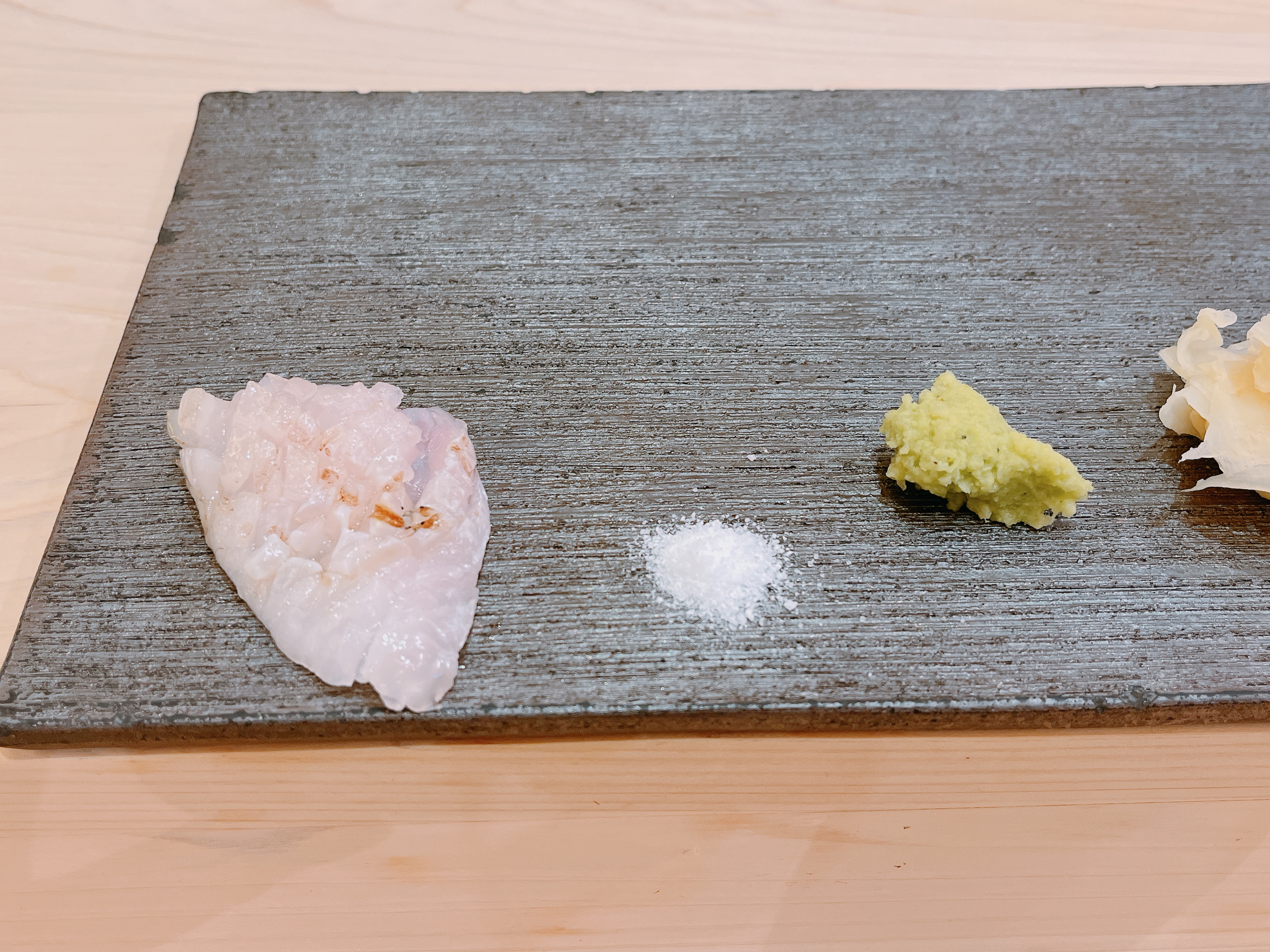 광어지느러미살. 살짝 타타키식으로 구워졌는데 소금과 와사비를 곁들여서 먹었어요. 굿굿.