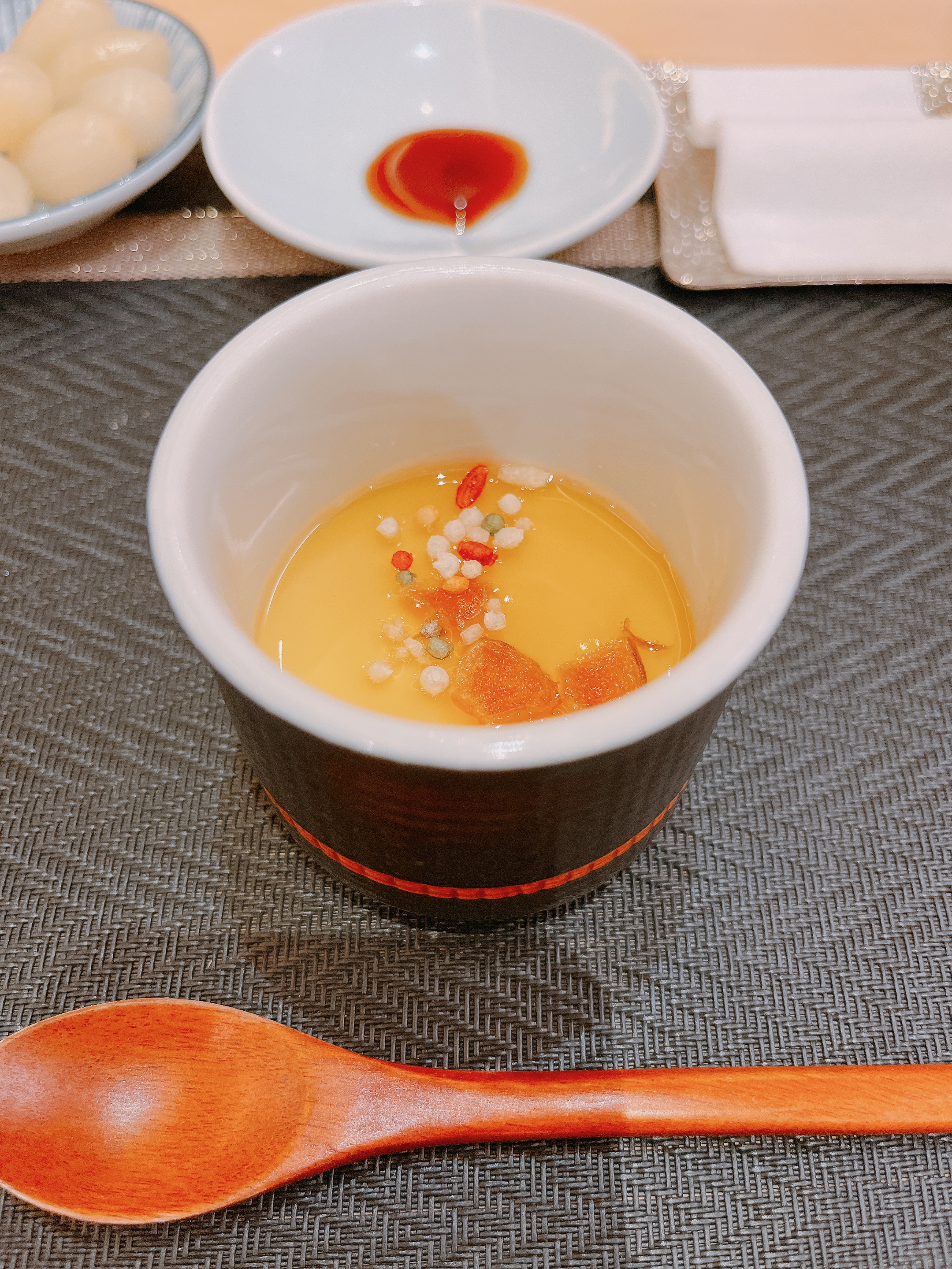 디너 오마카세 시작은 감자튀김이 올라간 계란찜. 말랑말랑한 식감이 좋았어요. 감자튀김도 잘 어울렸고.