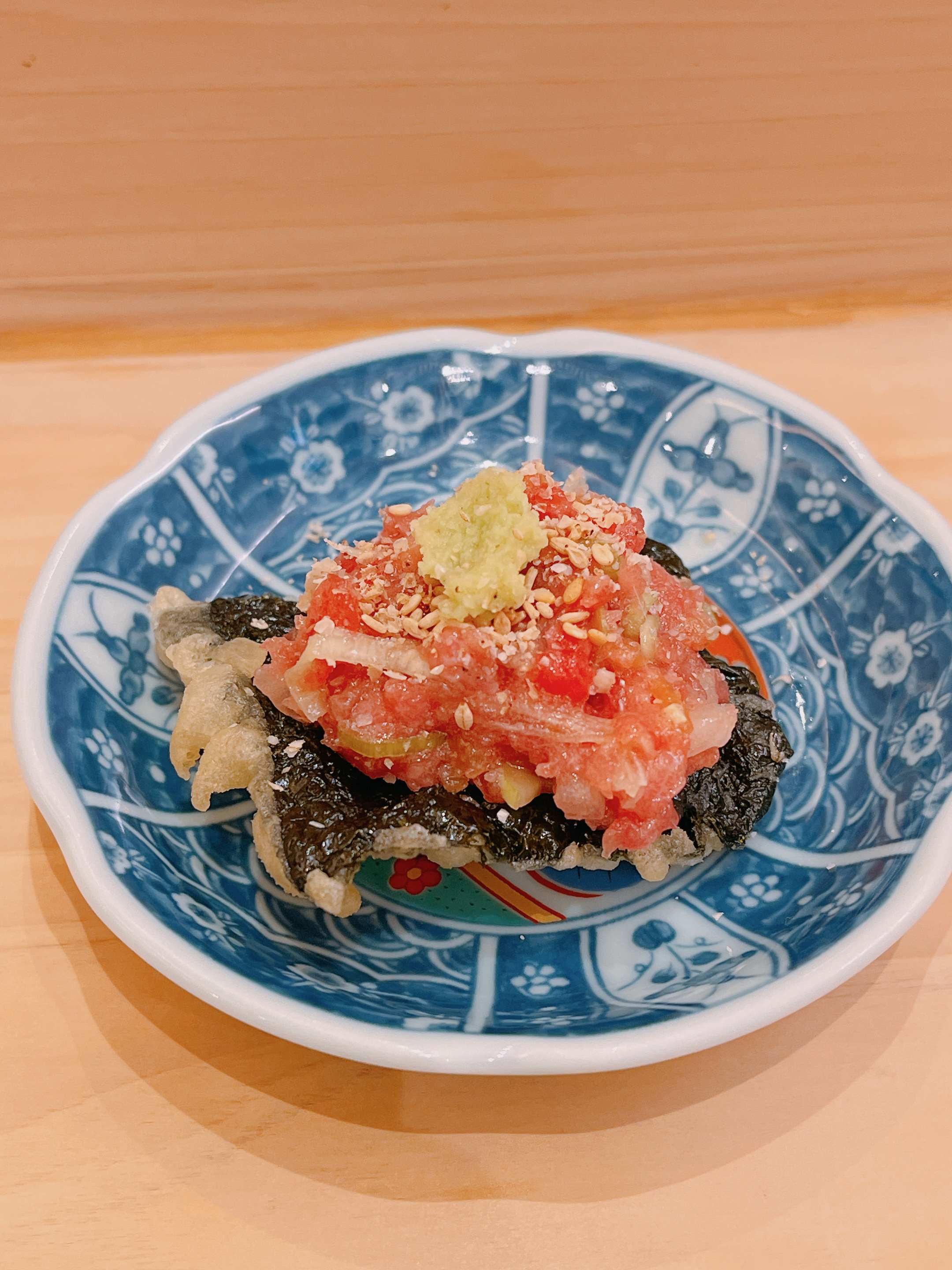 참치뱃살, 대파, 단무지를 갈아서 버무린 걸 튀긴 김위에 올린 메뉴.