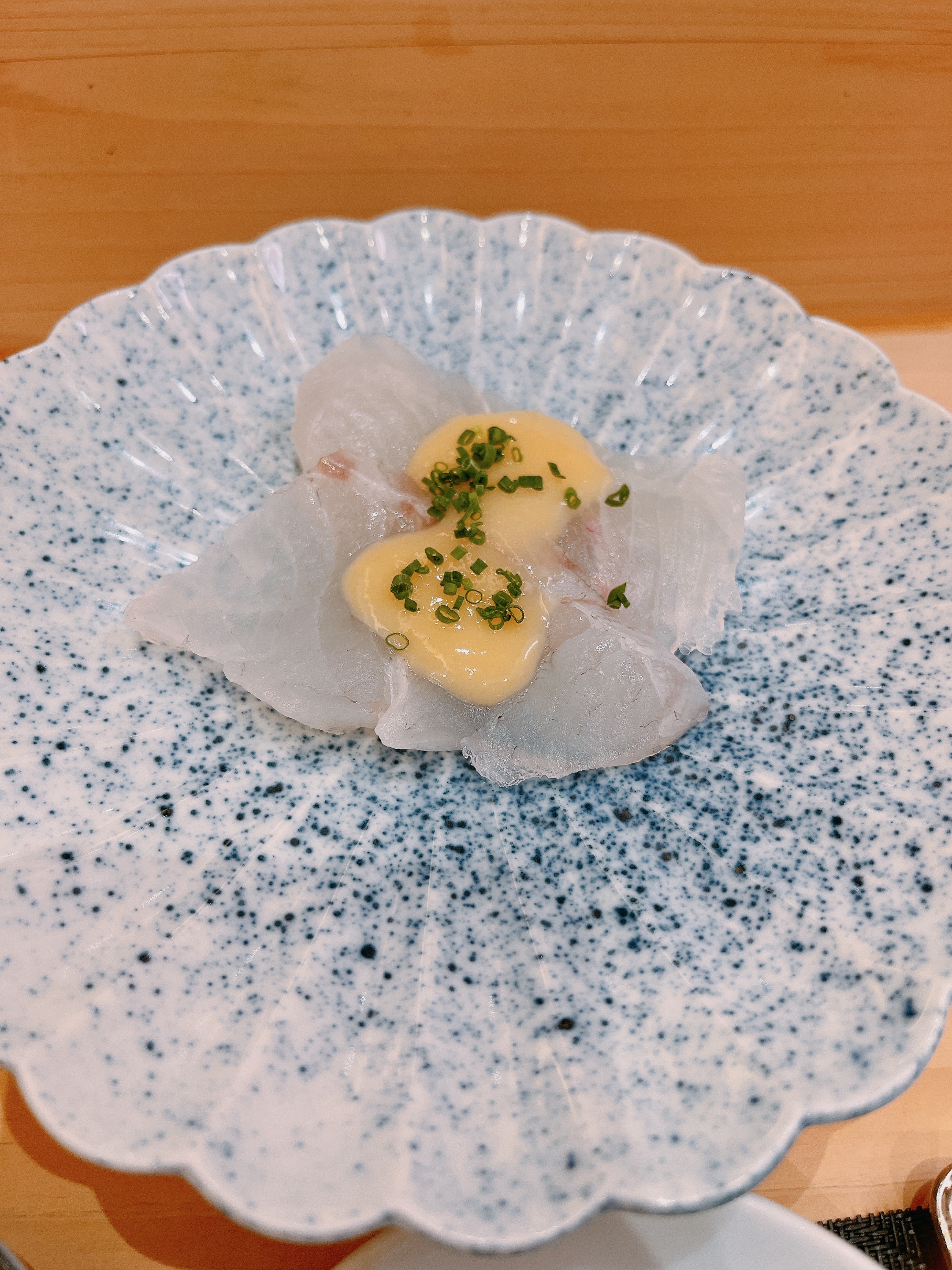스미소(일본식 식초된장)가 올려진 광어, 농어 사시미. 회는 물론이고 소스가 진짜 맛있었어요.