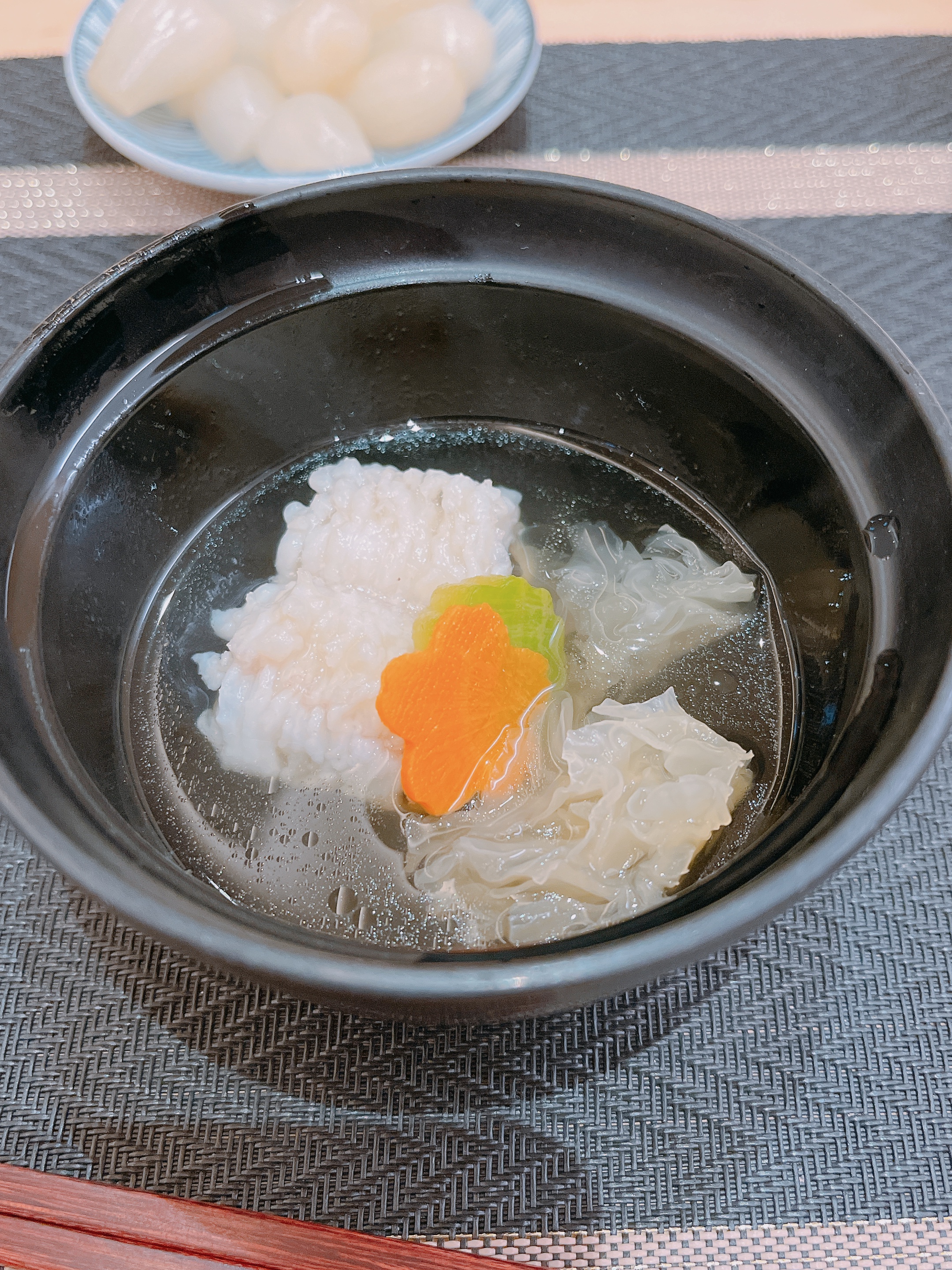 장어, 백목이 버섯이 들어간 맑은 국물.
