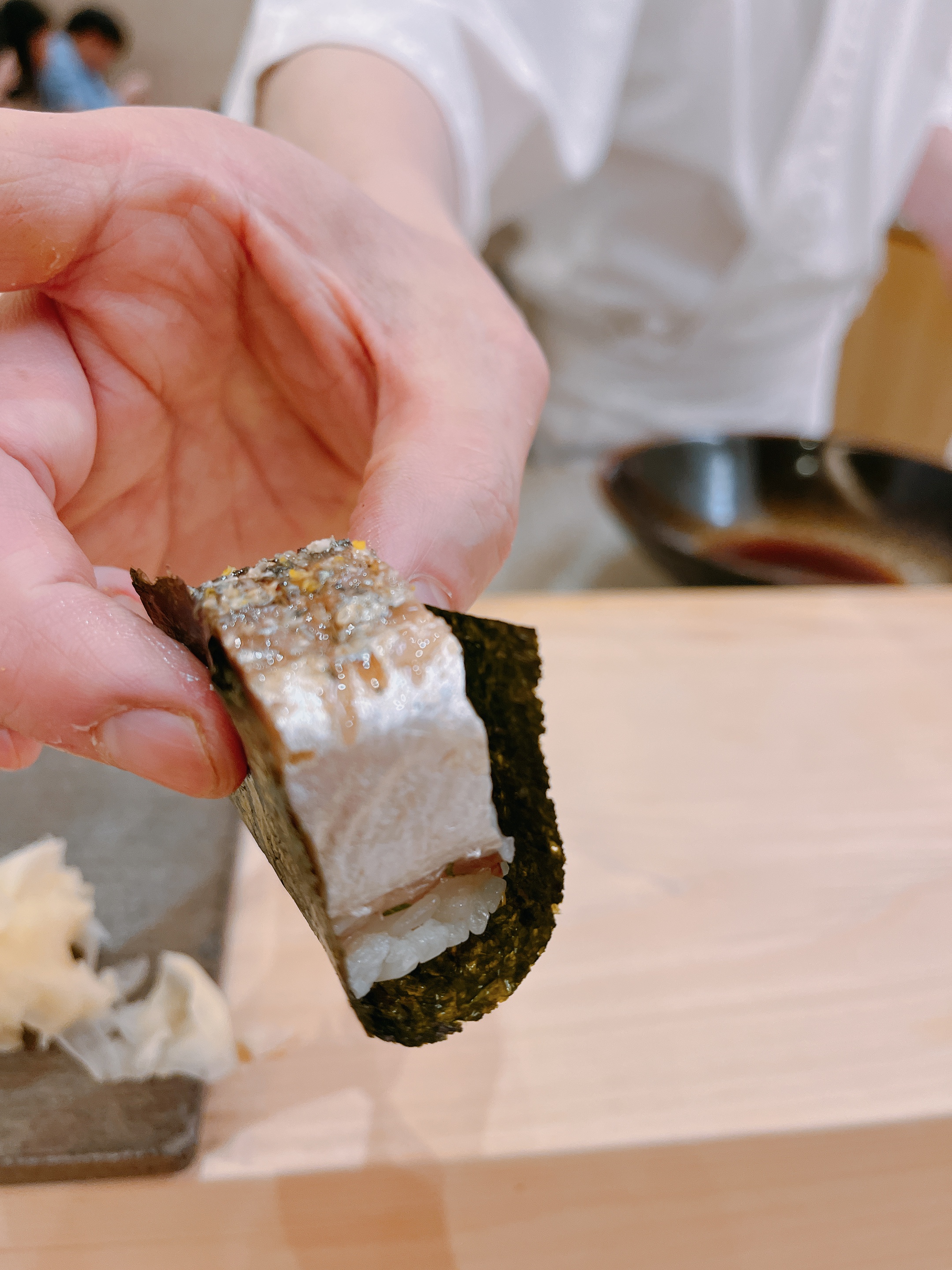 아귀간 김말이. 셰프님이 사진 찍기 좋게 들어주시더라구요. 내장계열 좋아하는 저에게 즐거운 맛의 초밥이었습니다. 일단 너무 신선해요😋