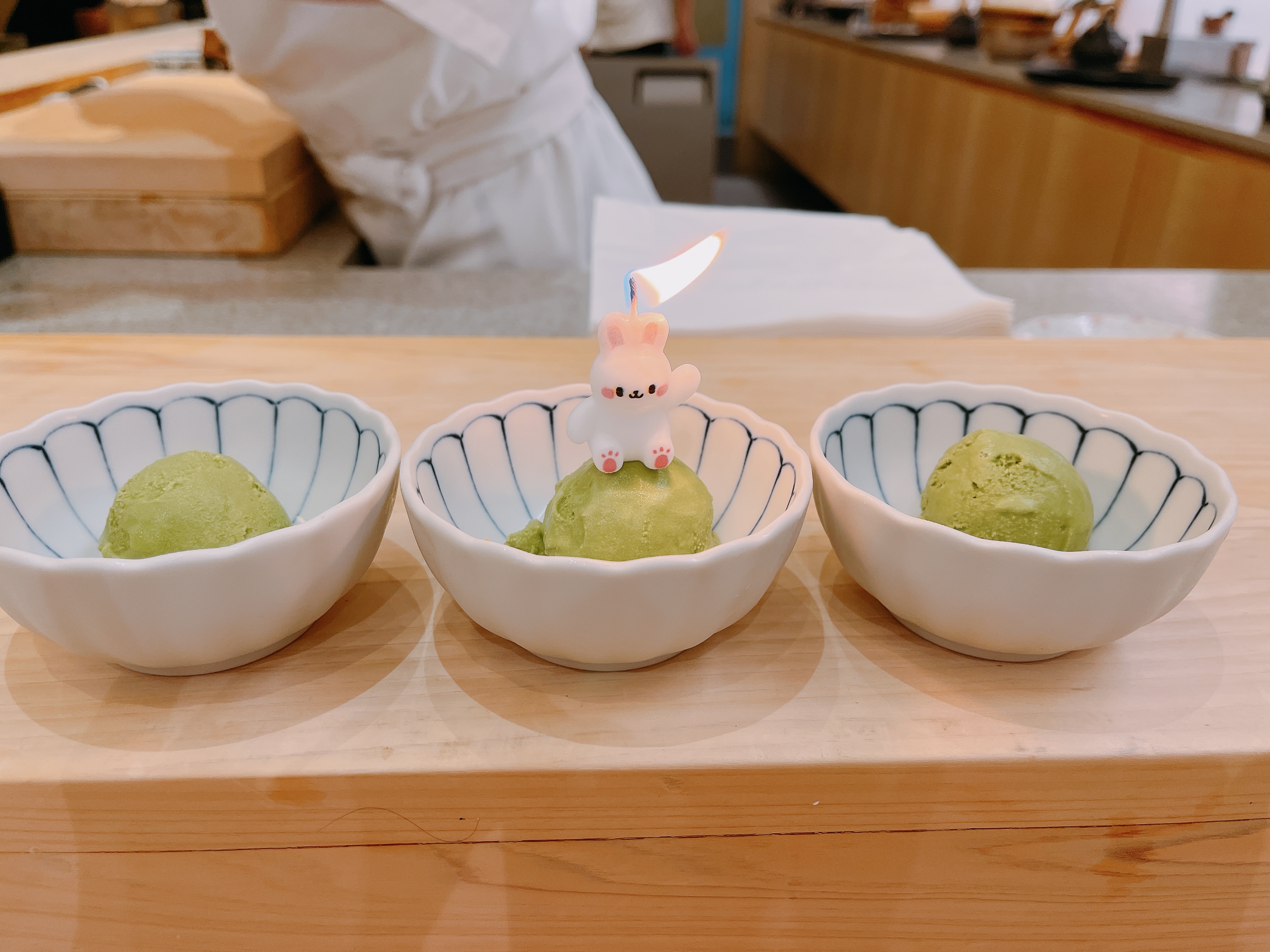 마지막 후식, 녹차 아이스크림. 셰프님이 무슨 축하할 일 있냐고 물어보시길래 뭐지? 했더니 저 촛불 붙여주시려고 그랬던 거였어요🥰