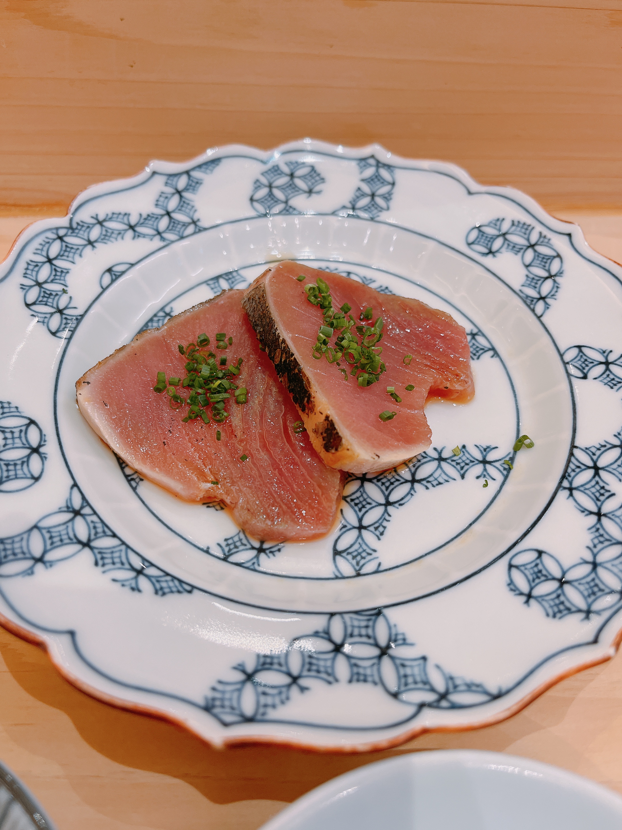 간장에 절인 어린생참치(메지마구로). 겉을 타타키식으로 살짝 구운 게 너무 좋았어요.