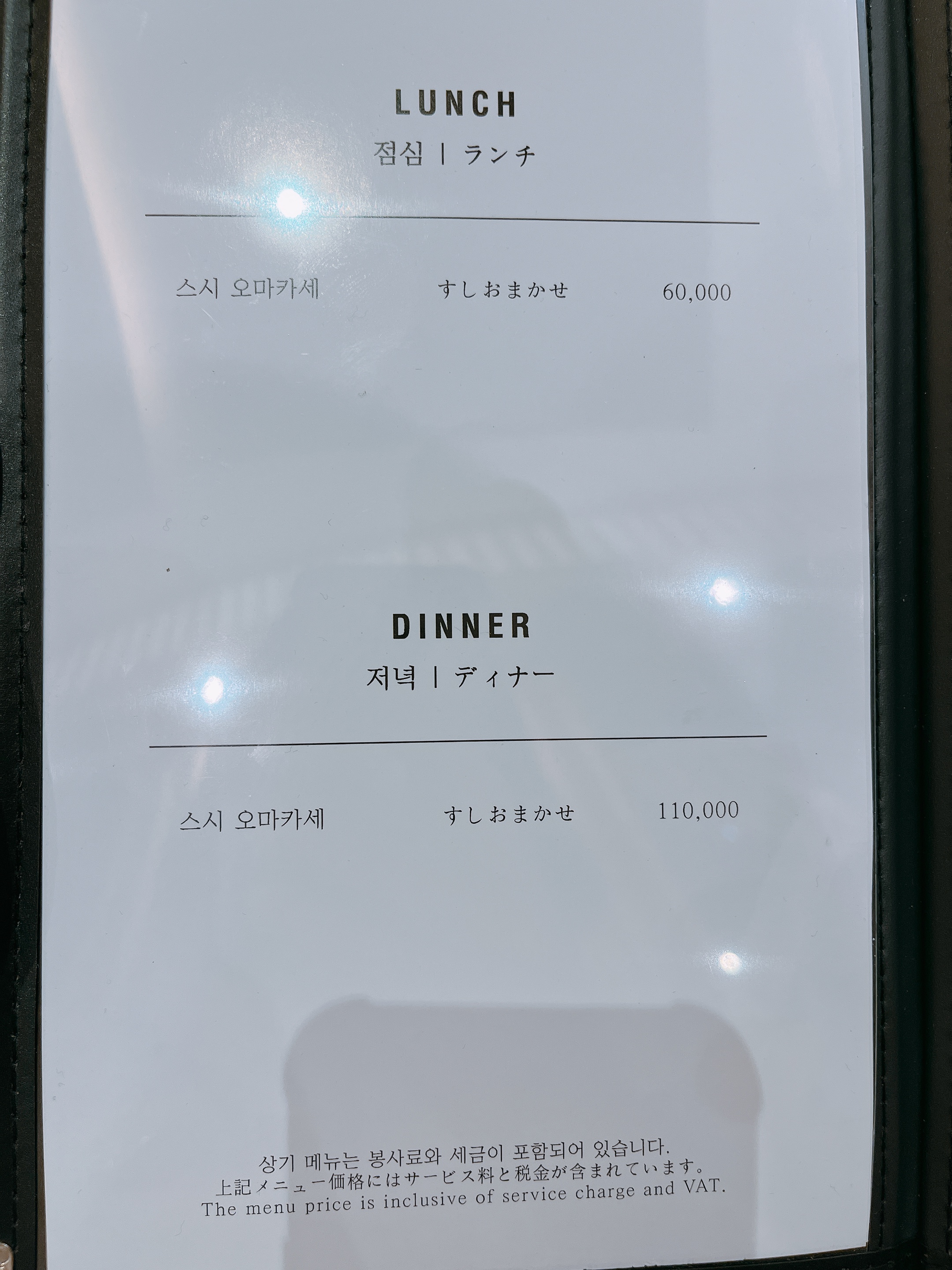 메뉴는 깔끔하게 런치 오마카세와 디너 오마카세가 있어요. 어차피 예약하고 결제까지 다 끝내고 온 거라 메뉴판의 큰 의미는 없어 보이지만 역시 있는게 낫겠죠. 런치는 60,000원, 디너는 110,000원입니다.