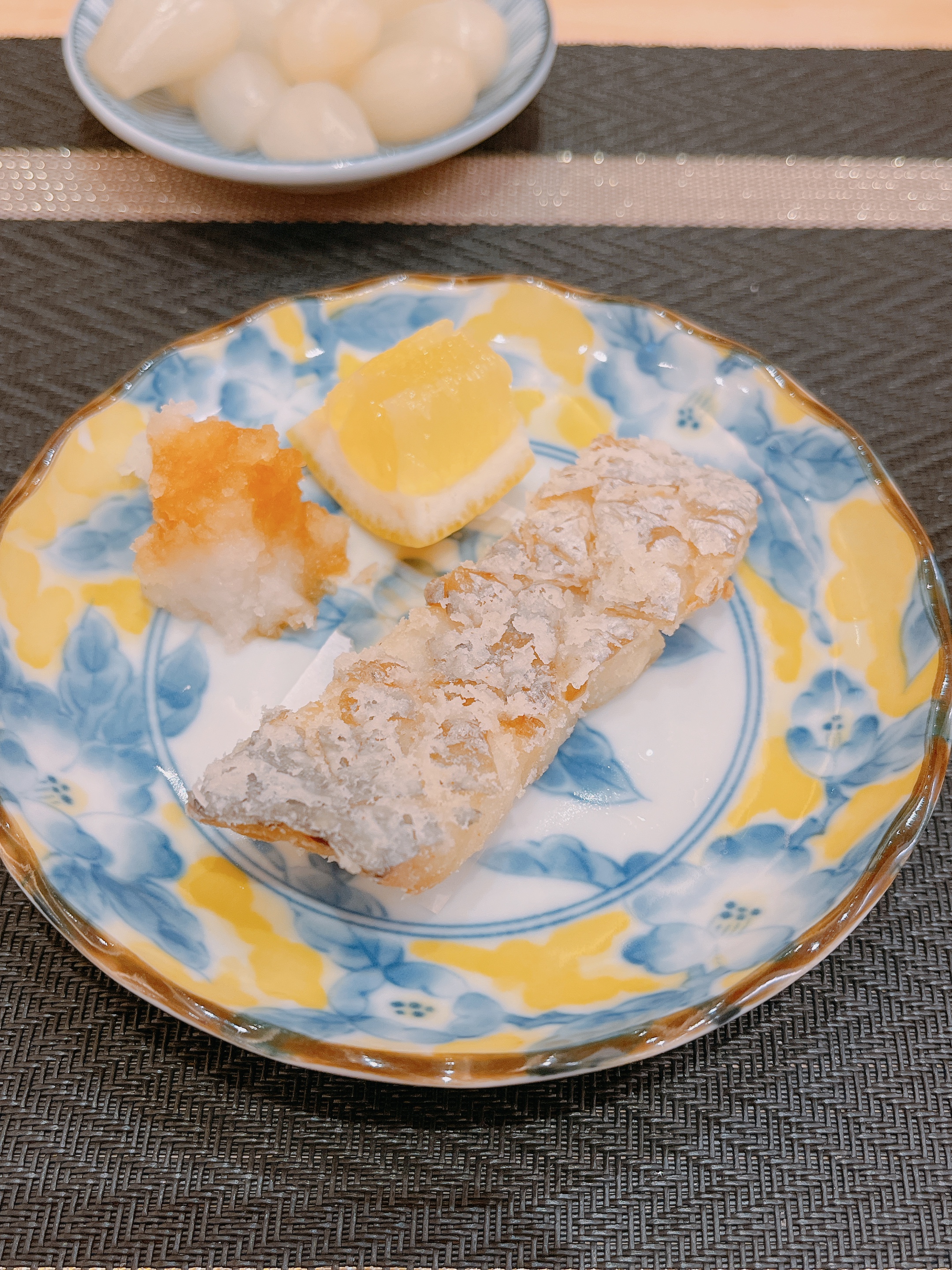 갈치튀김. 간 무와 레몬즙을 뿌려서 먹습니다.
