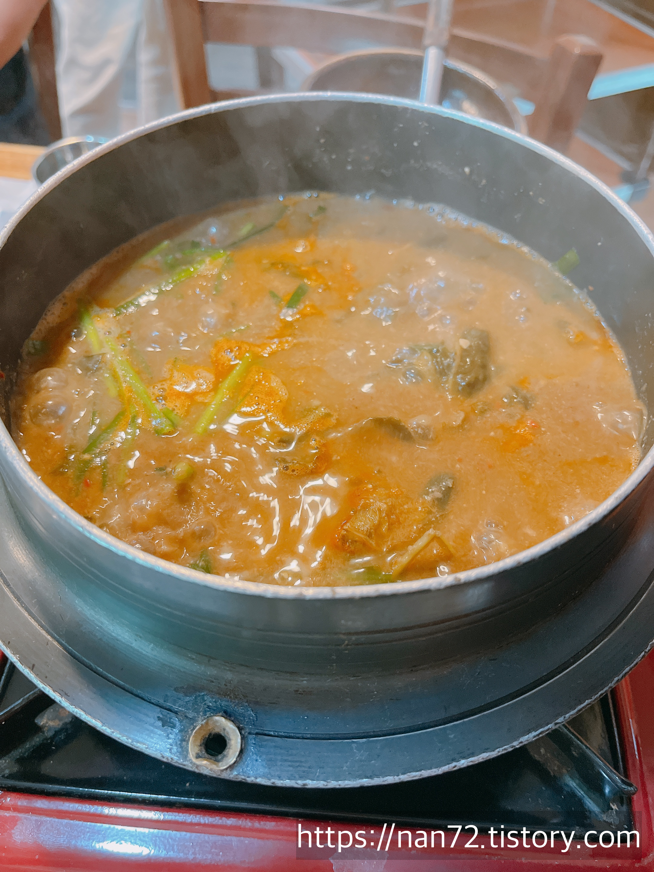 추어탕은 이렇게 솥냄비에 나옵니다. 1인분씩 나오는 게 아니라 팔팔 끓으면 그때 덜어 먹으면 됩니다.