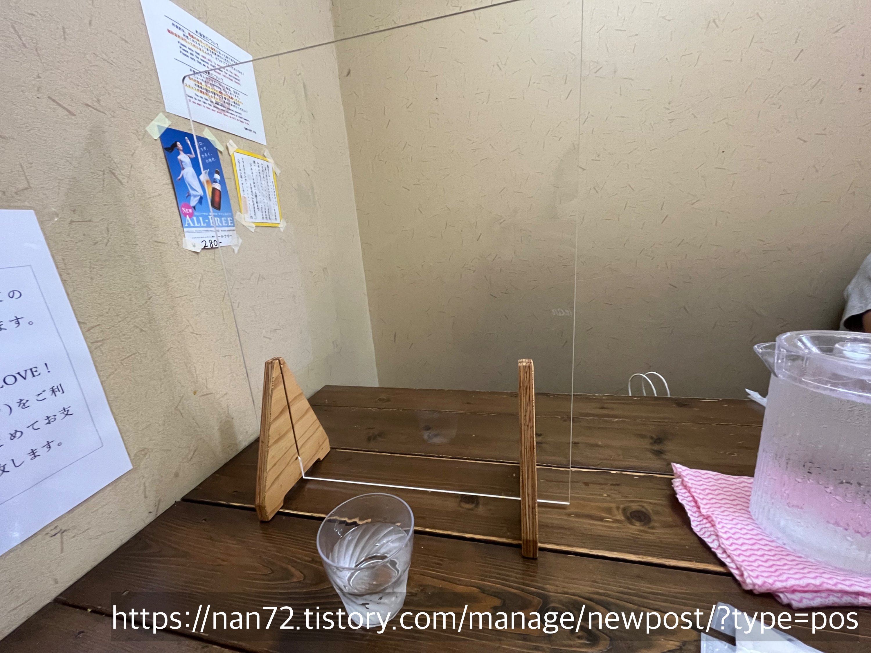 10분 정도 기다렸을까? 예상했던 대로 가게에 금방 들어갈 수 있었습니다. 공간이 작은 편이라 다른 손님이랑 합석해서 마주 보고 먹게 되는 일도 생깁니다. 코로나 대비용으로 가운데에 놓인 가림막이 눈에 띄네요.