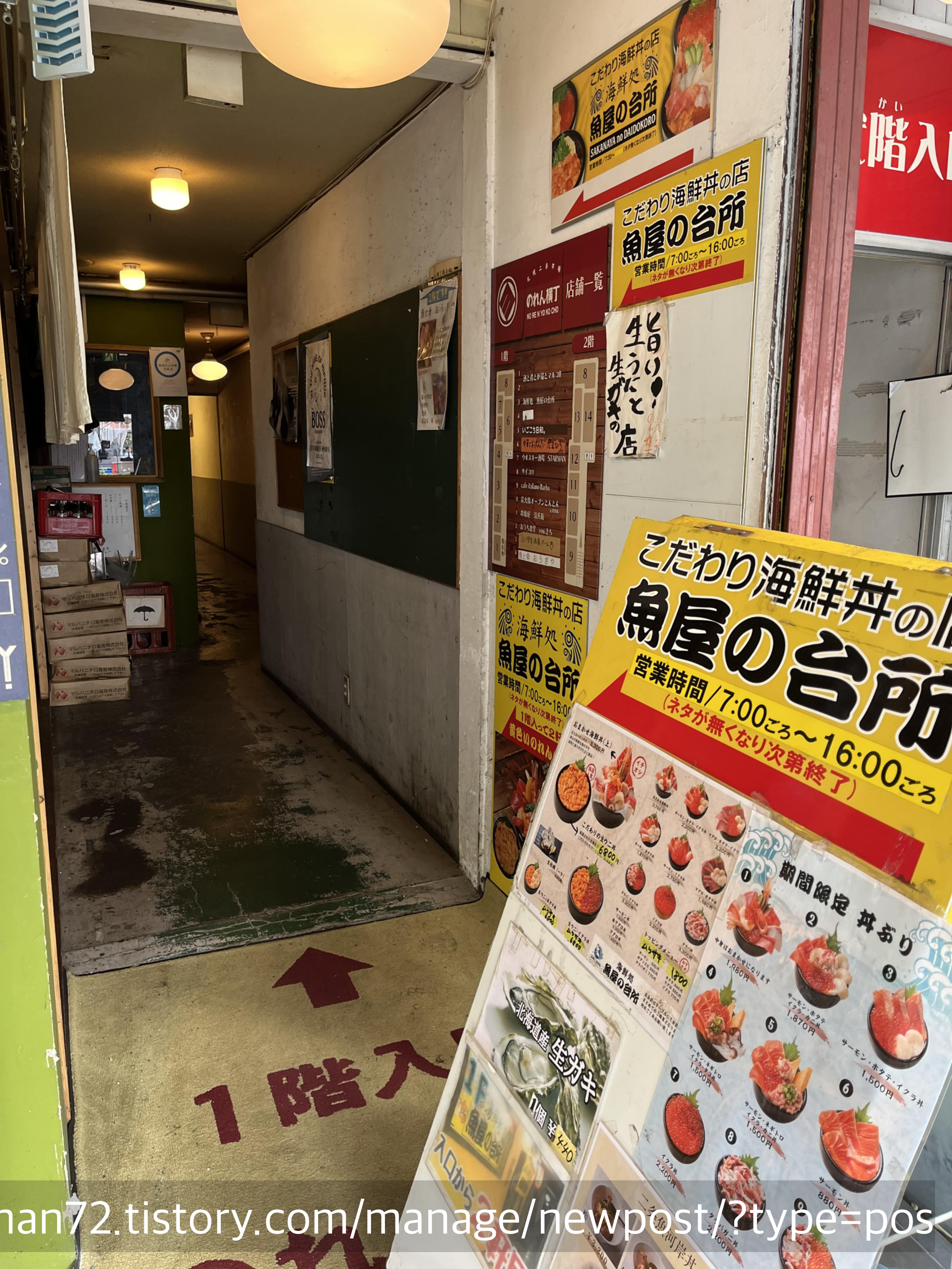 근데 사실, 니죠시장에서 카이센동 먹으려고 후보를 세 곳 정도 꼽아놓긴 했는데 하필 이때가 일본 황금 3일 연휴이기도 해서 사람이 엄청 많을 걸 예상했단 말이죠? 가게도 그리 크지 않다고 들어서 웨이팅 꽤 오래 하거나 아님 적당히 눈에 보이는 가게 들어가서 먹어야겠다... 고 생각했는데 시장 들어간 지 거의 5분 만이었나, 목표로 했던 가게 중 하나가 바로 눈에 딱! 들어온 거예요. 카이센동 가게를 찾아야지 하는 생각은 있었지만 이 <사카나야노 다이도코로>에 먼저 가보자! 했던 건 아니었는데 말이에요. 그래서 완전 신나서 입구로 들어갔어요. 사실 줄이 별로 없어 보여서 더 신난 것도 있었네요...