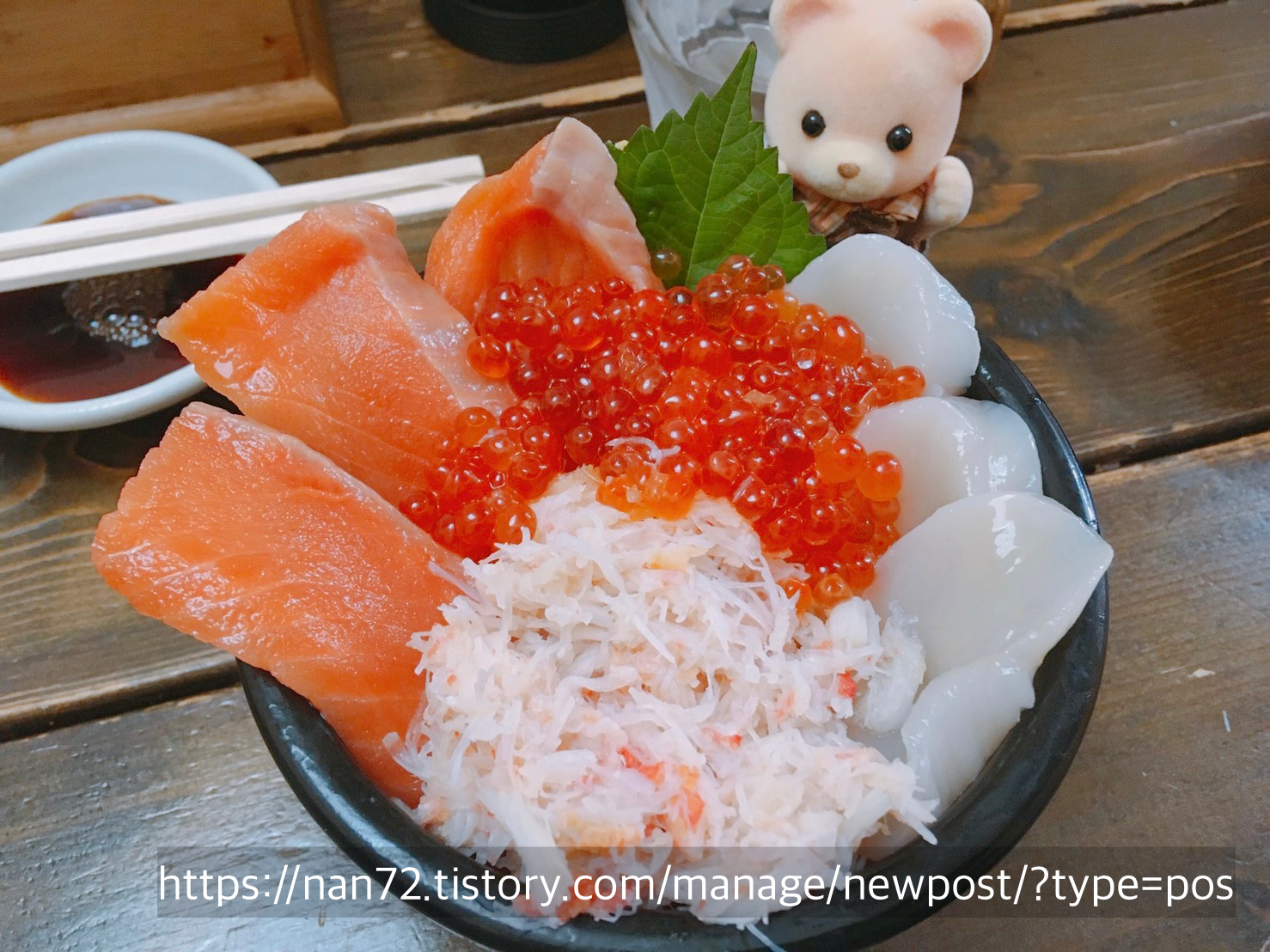 요건 친구가 주문한 연어, 가리비 관자, 연어알, 게살 카이센동입니다. 친구의 소중한 마스코트 인형도 같이 찍혔네요. 이 자리를 빌려 사진을 흔쾌히 쓰라고 넘겨준 친구에게 감사를👍