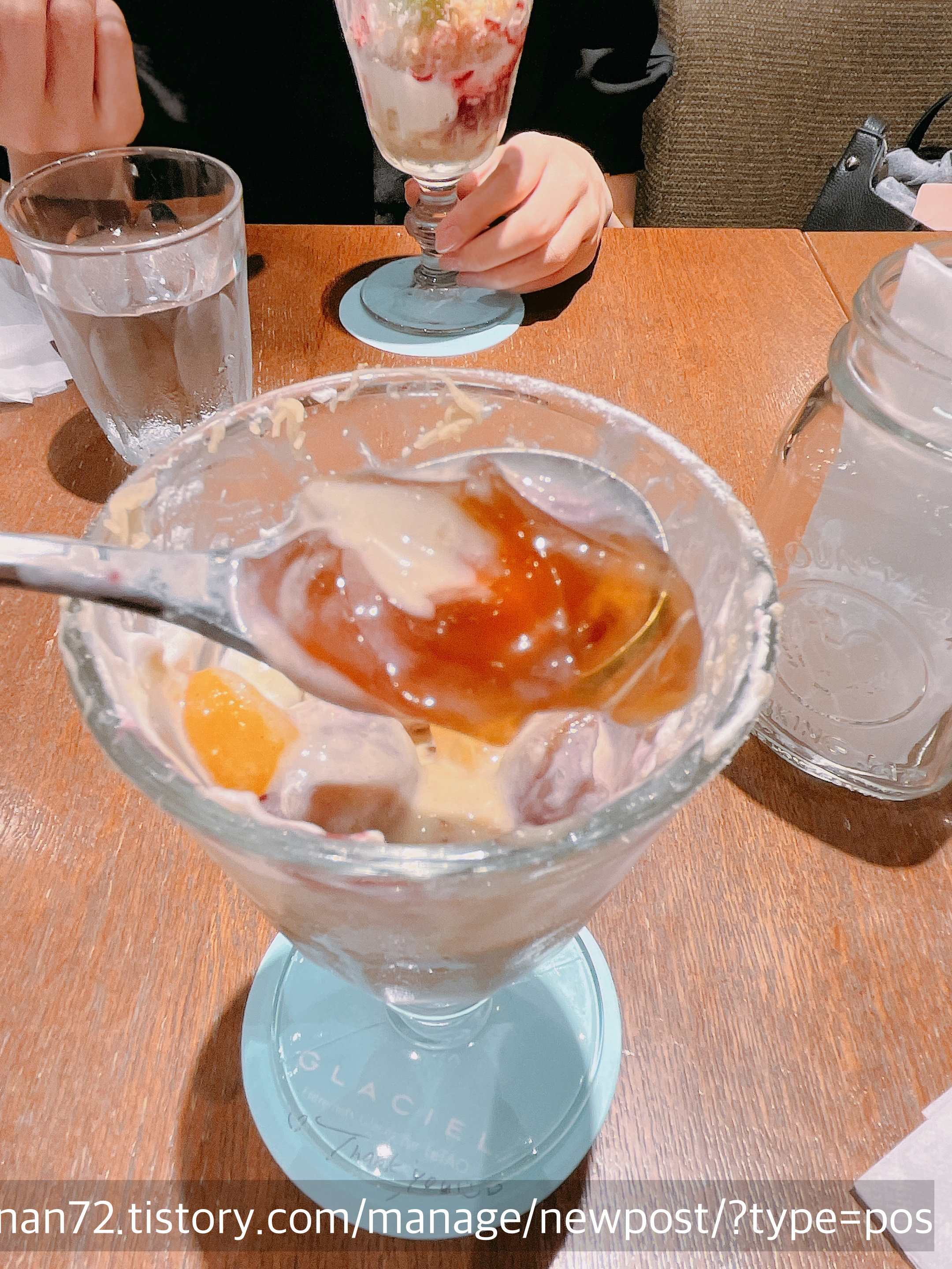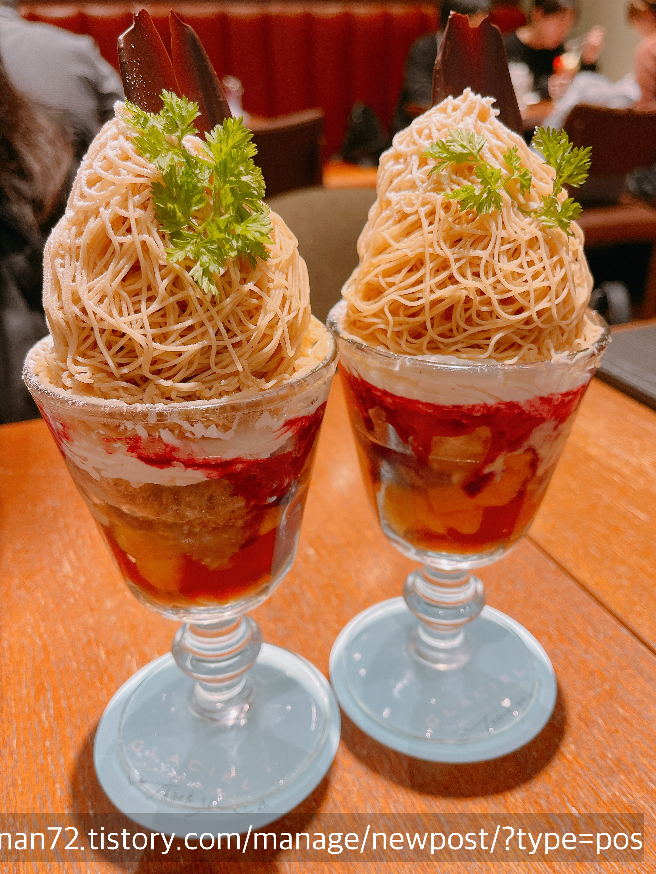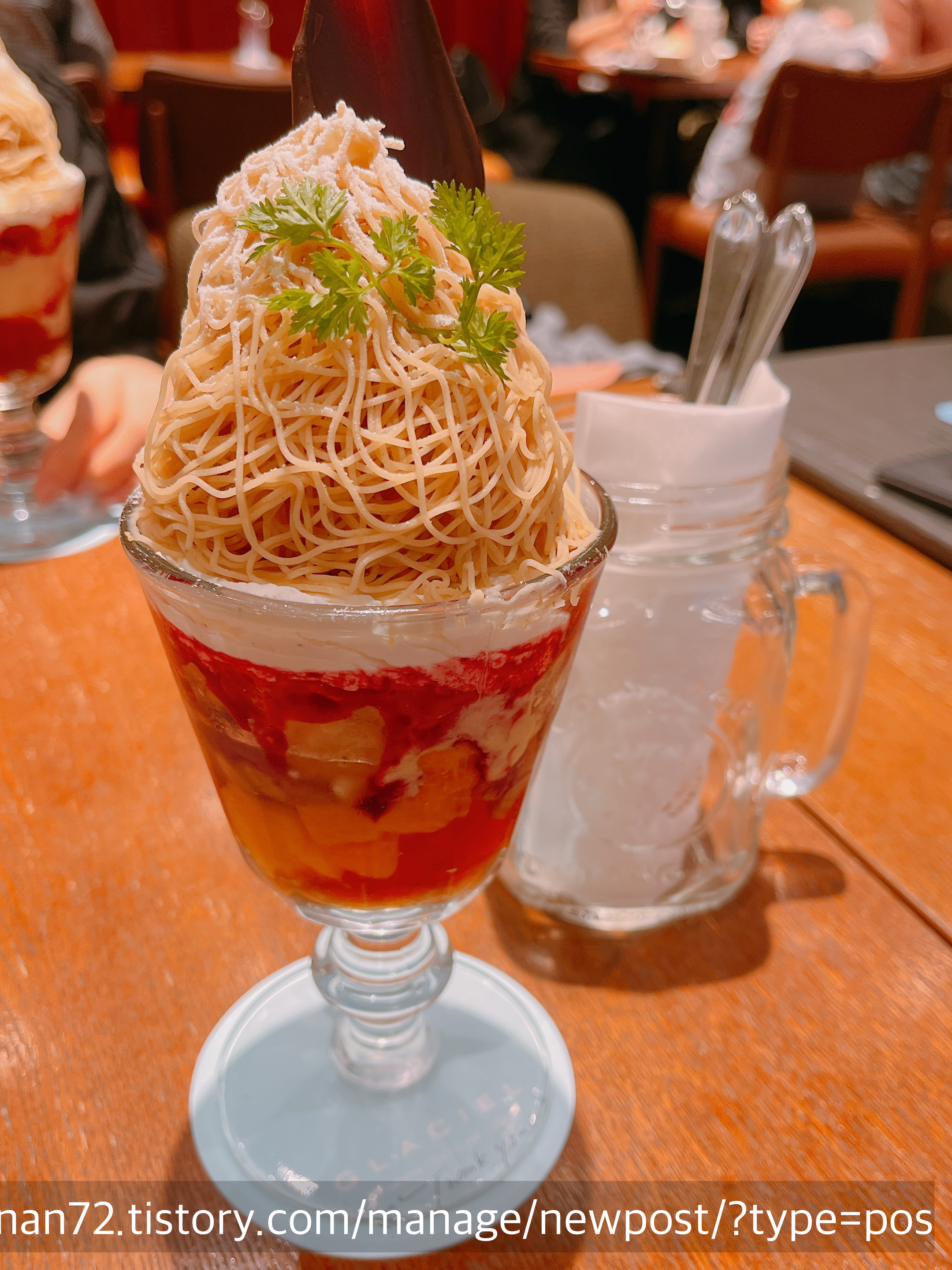 정말 진심으로 하나씩 시켜 먹어 보고 싶었지만 그럴 수는 없었기에 고심에 고심을 하다 기간한정 메뉴인 <몽블랑 오마롱(첫 번째 나온 파르페)>을 주문했습니다. 친구도 같은 걸로 주문했어요. 둘이서 다른 걸 시켜서 나눠먹는 방법도 있었으나, 전 이 파르페의 처음부터 끝까지를 전부 맛보고 싶었기에 나눠 먹는 걸로는 성에 안 찰 것 같았어요.