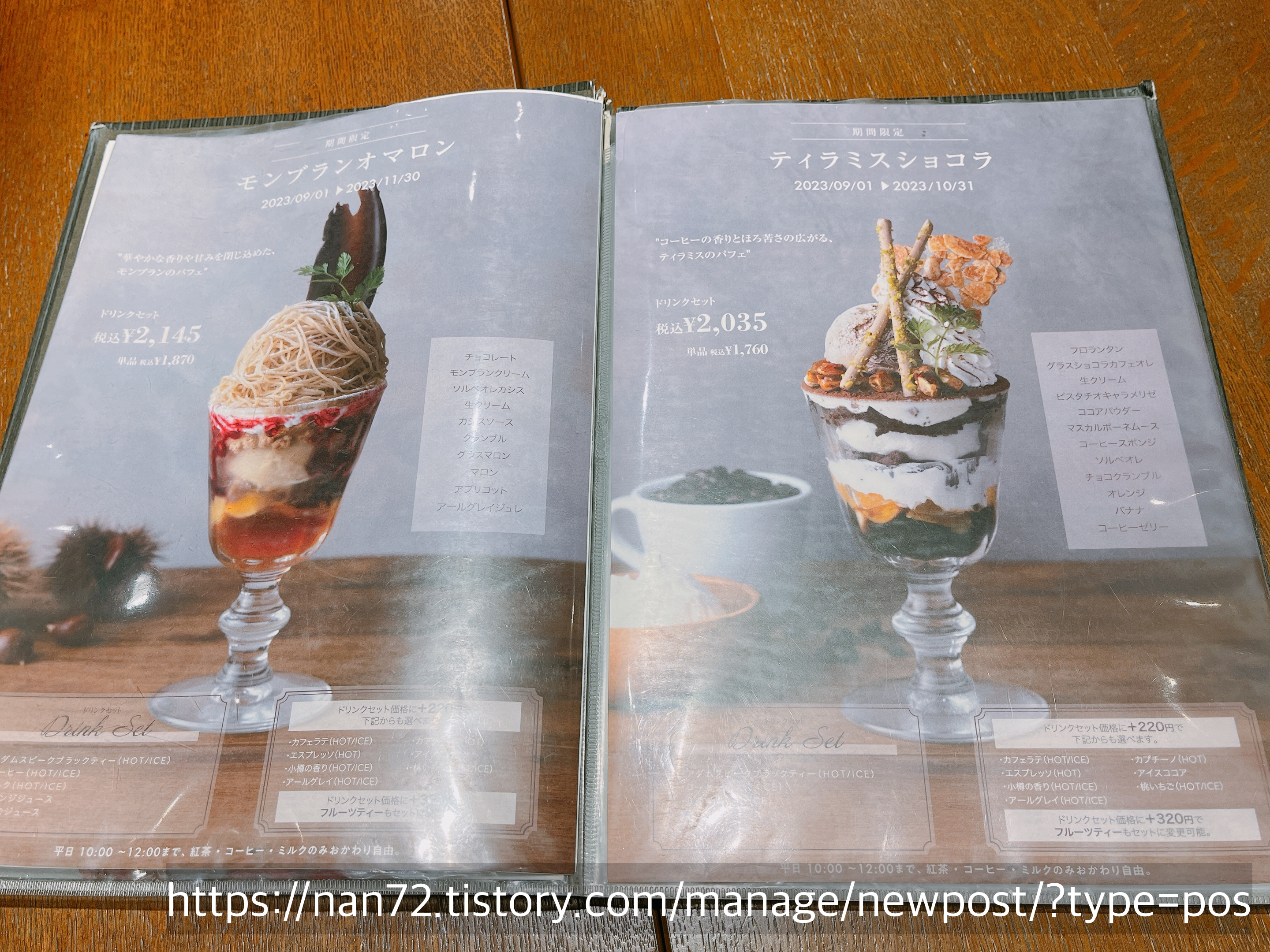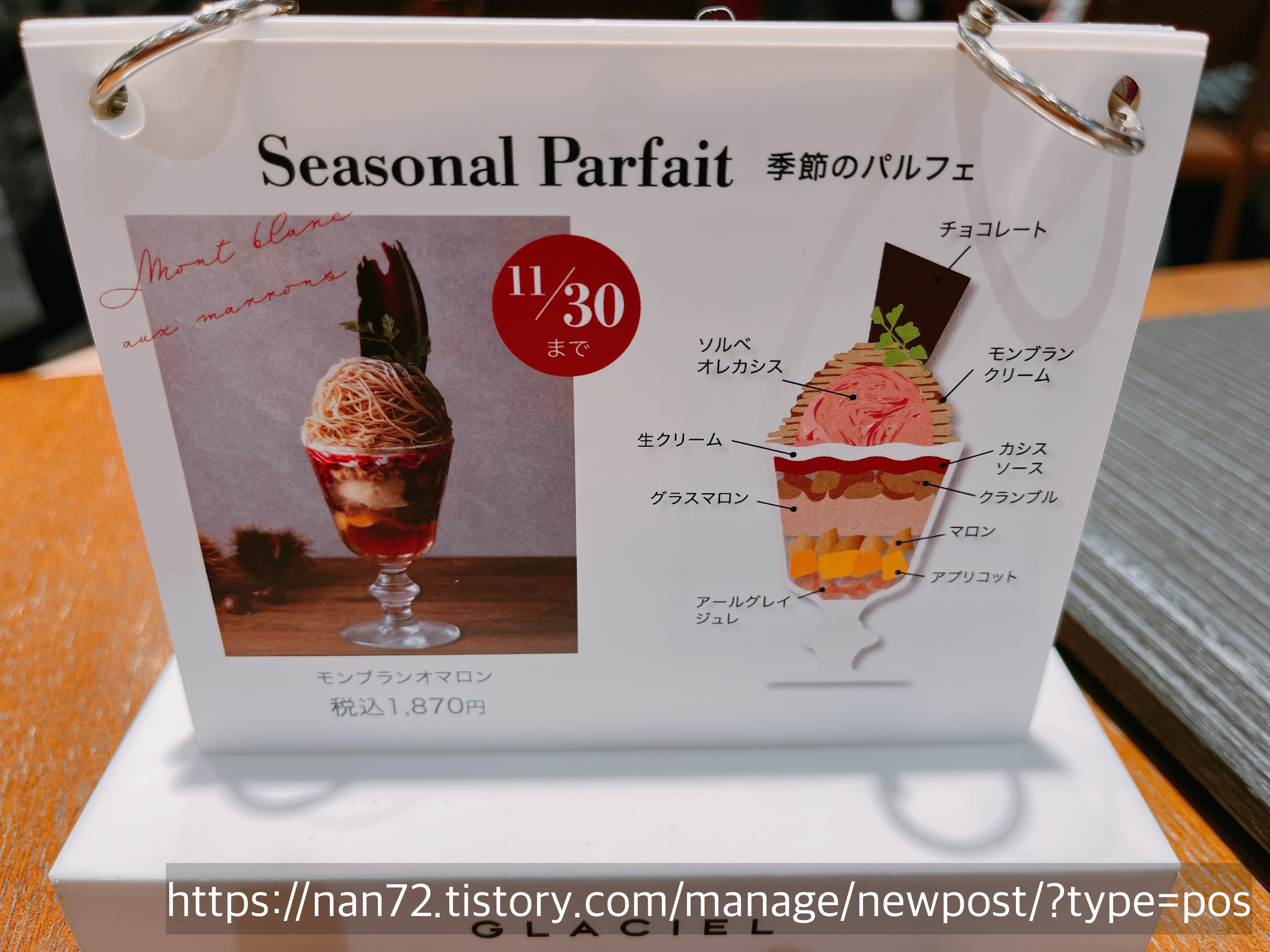 저랑 친구가 시킨 기간한정 파르페에 대한 설명이 테이블 위에도 올려져 있더라구요. 아무래도 기간한정 계절 메뉴다 보니 이런 식으로 광고를 하는 것 같았습니다. 몽블랑 오마롱은 11/30일까지.