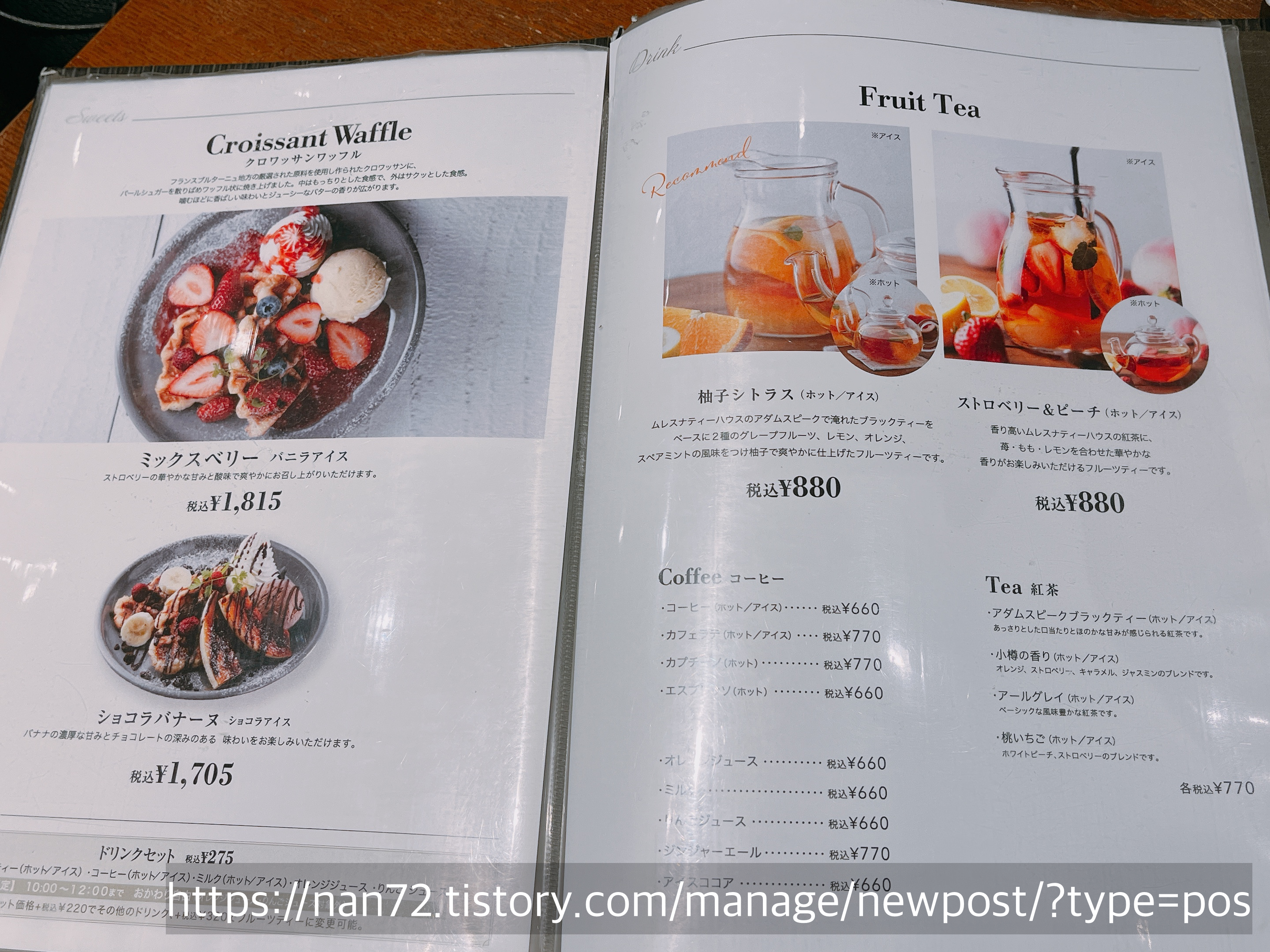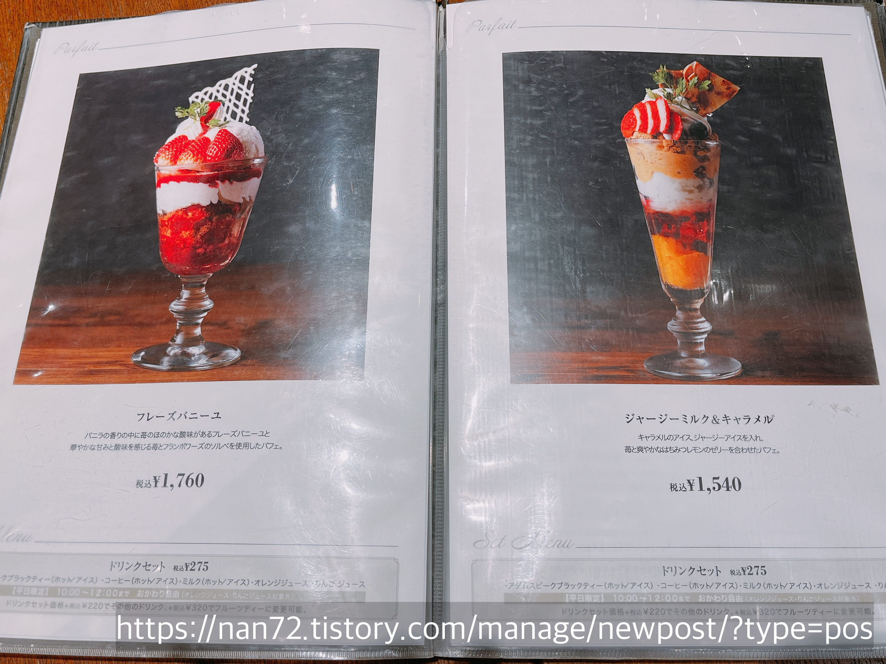 메뉴판을 여는데 파르페가... 애니에서나 볼 법한 화려한 파르페의 향연이 펼쳐지는 것이에요... 메뉴판 보면서도 마음속으로 침을 줄줄 흘렸던 것 같아요(ㅋㅋㅋㅋ) 아니 진짜 사진으로만 이러는 게 아니라 실물로 이런 퀄리티의 파르페가 나온다면 너무 굉장하잖아요. 들어간 재료이름도 하나하나 기재되어 있는데 이미 제 마음은 뺏겨버렸어요...