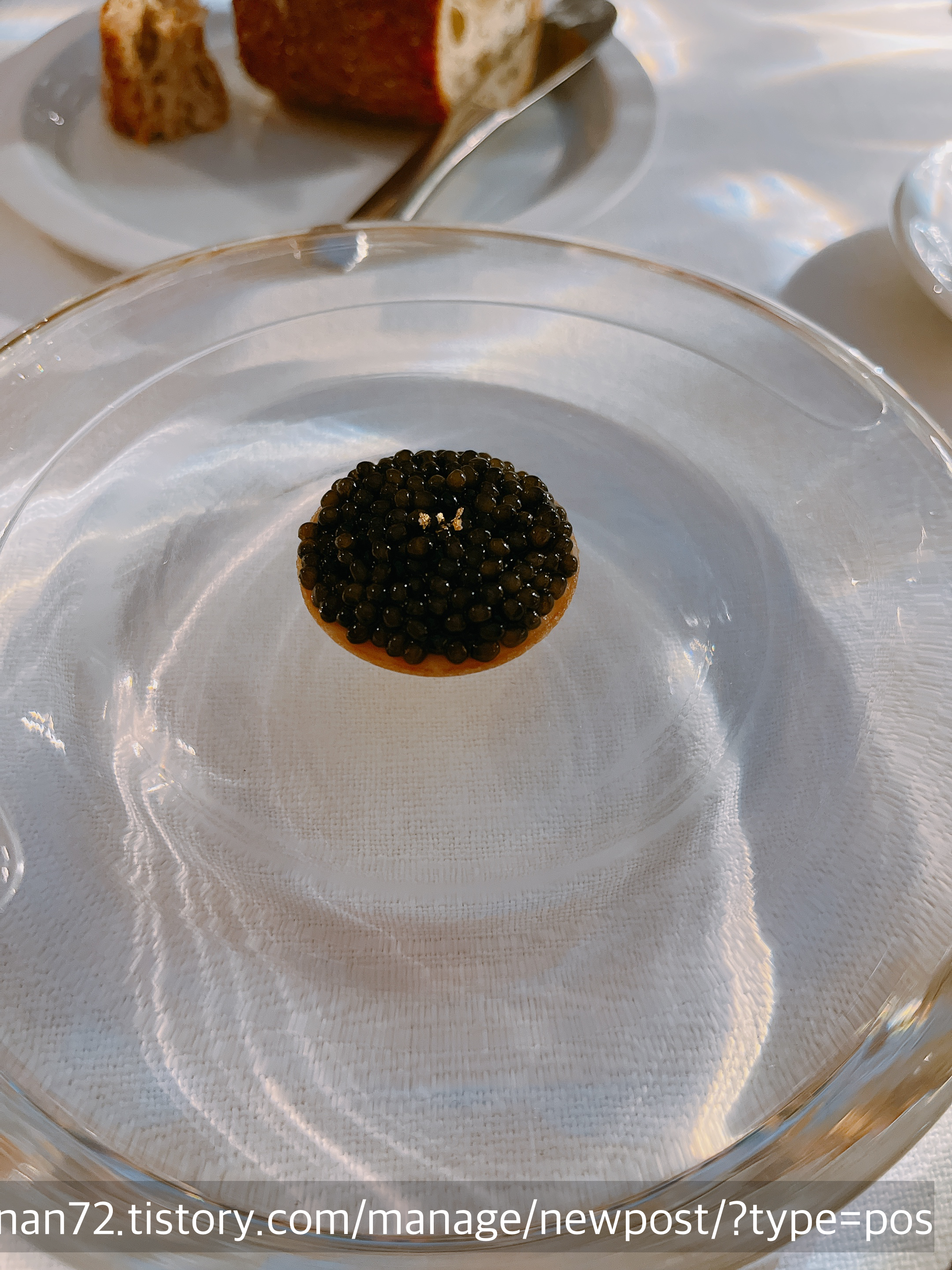 아뮤즈부쉬. 크리스탈 캐비어가 수북이 올라간 타르트. 치즈와 캐비어 맛이 절묘했어요.
