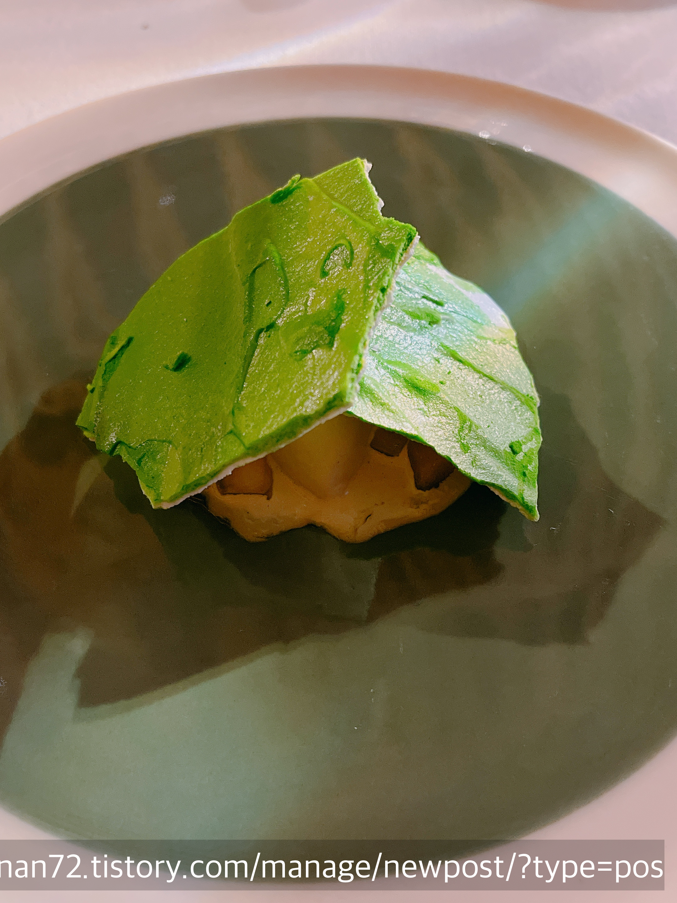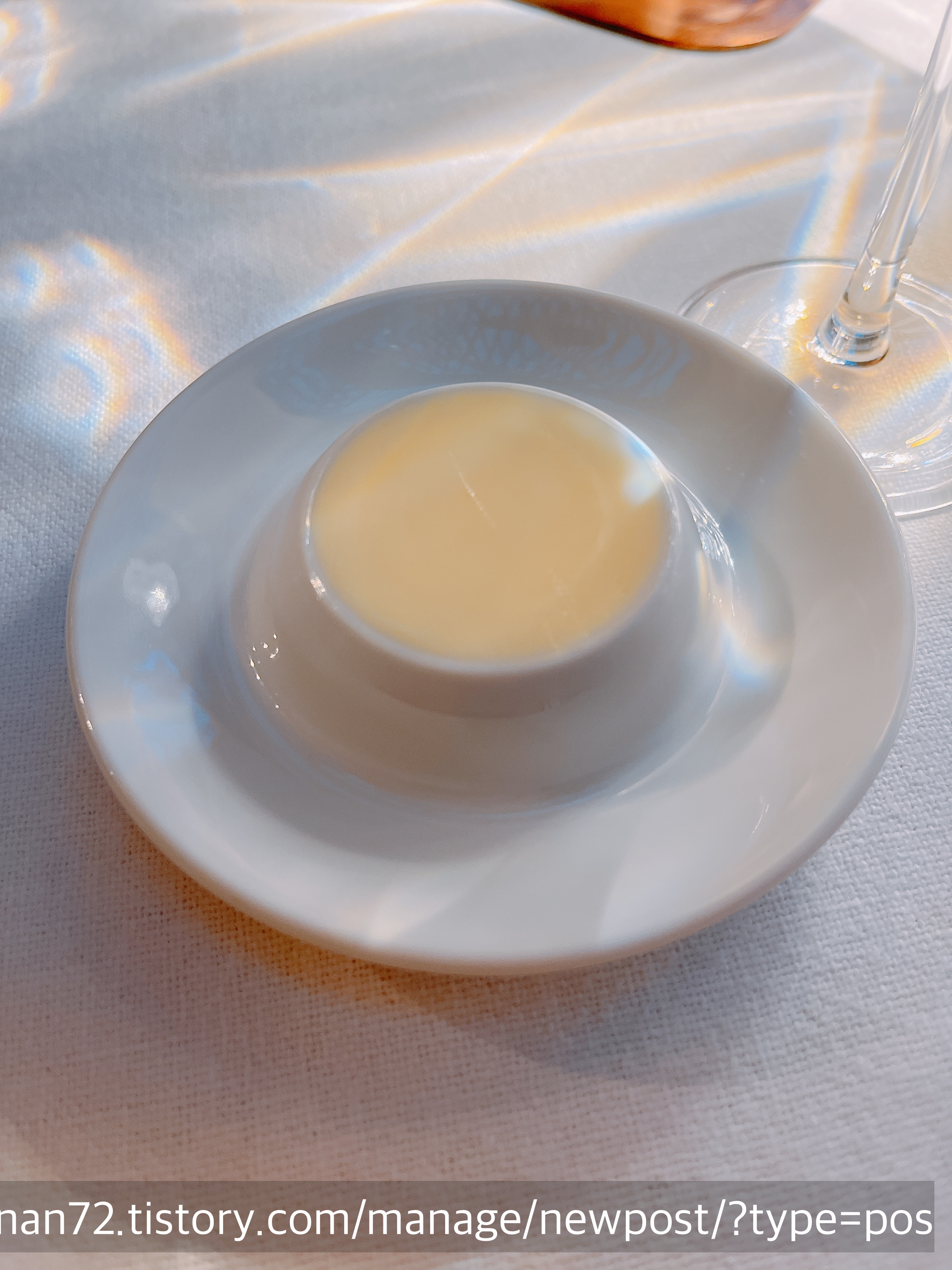 아뮤즈부쉬(메인 식사 전에 먹는 가벼운 요리)로 나온 유정란 플랑. 진짜 달걀 껍질 안에 플랑이 담겨 있어서 조심조심 숟가락으로 떠서 먹는데 전혀 비리지 않은 진한 계란맛이 너무 좋았어요. 엄청 부드러웠구요. 사실 이런저런 설명을 자세히 해주셨지만 세세하게는 기억나지 않네요 하하.