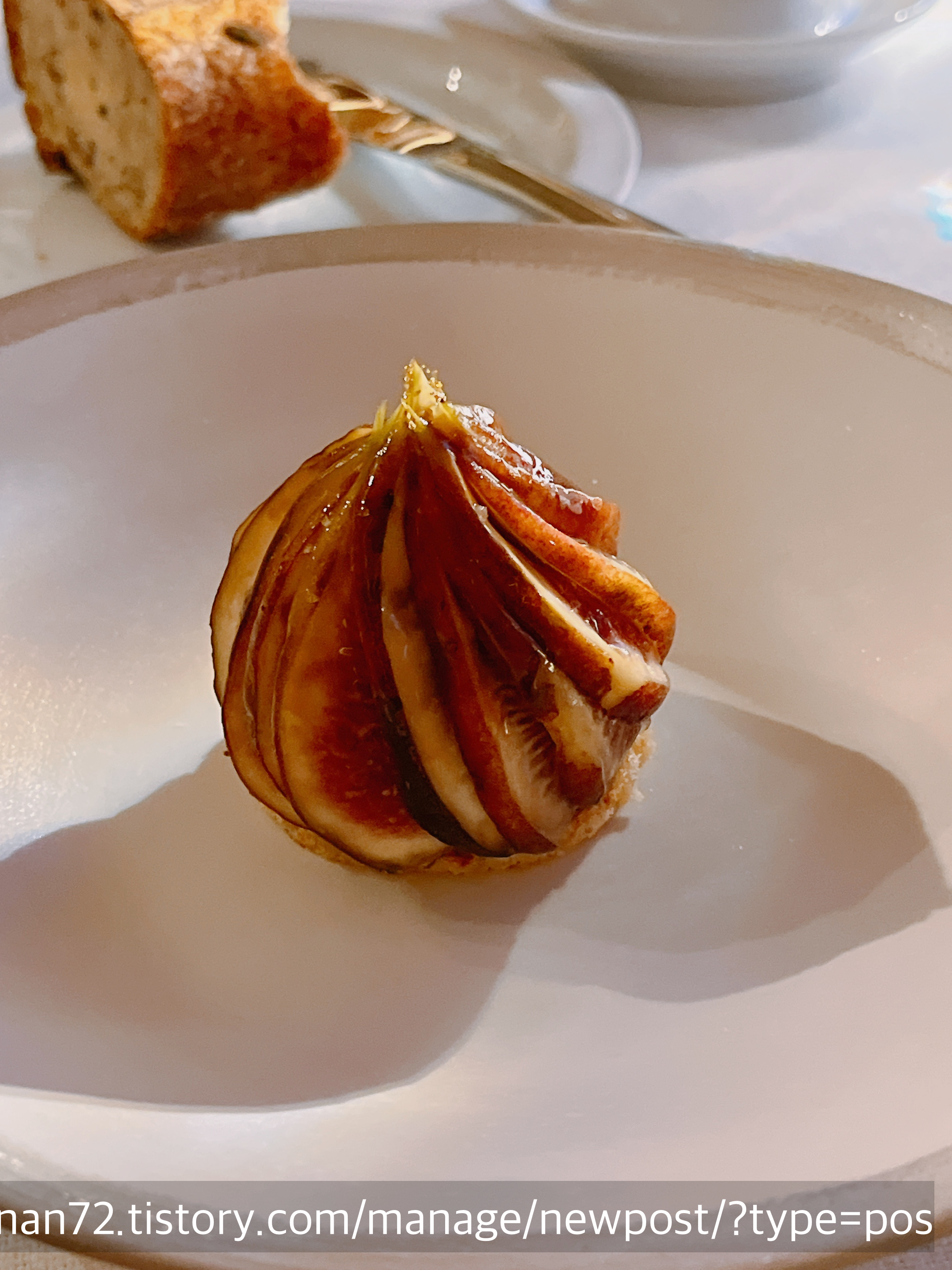 무화과 디저트. 무화과 밑에는 브리오쉬, 무화과 안쪽에는 서리태가 꽉 차 있는데 떡을 먹는 느낌이었어요. 무화과라 하면 달다는 이미지가 있었는데 이건 생각보다 달지 않아서 신선했네요.
