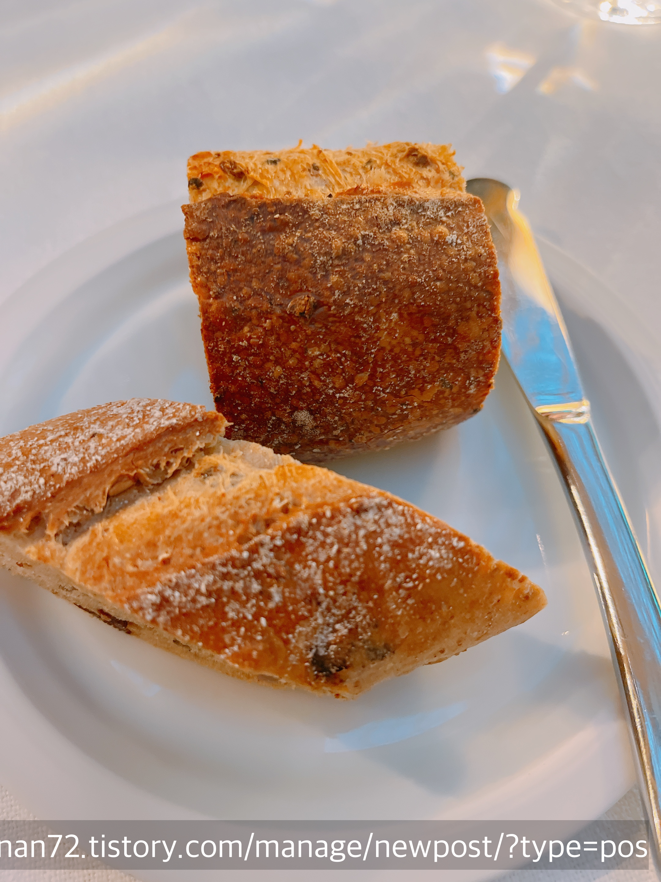 식전빵으로 나온 호밀빵과 올리브 바게트. 그리고 무염버터. 빵은 딱 한 입 먹어보고 와 이거 정말 좋은 빵이구나 느껴질 정도로 맛있었어요. 함께 나온 무염버터를 발라서 잘 먹었죠. 저 무염버터, 처음에 캔들인 줄 알았다니까요ㅋㅋㅋㅋ 직원분이 테이블 중앙에 무염버터 있으니 빵에 발라서 드시면 된다고 안내해 주셨는데 아무리 찾아봐도 버터 같은 게 안 보여서 여쭤보니 바로 이거라고 알려주셨던... 아니 이게ㅋㅋㅋ 저 옆면을 포크로 찔러봤는데 딱딱한 그릇이라 아, 안에 캔들로 채워놓으신 거구나 하고 오해했었죠ㅋㅋㅋㅋㅋ 알고 보니 먹는 버터였습니다... 네.... 어쩐지 캔들치고는 가운데 심이 안 보이더라...