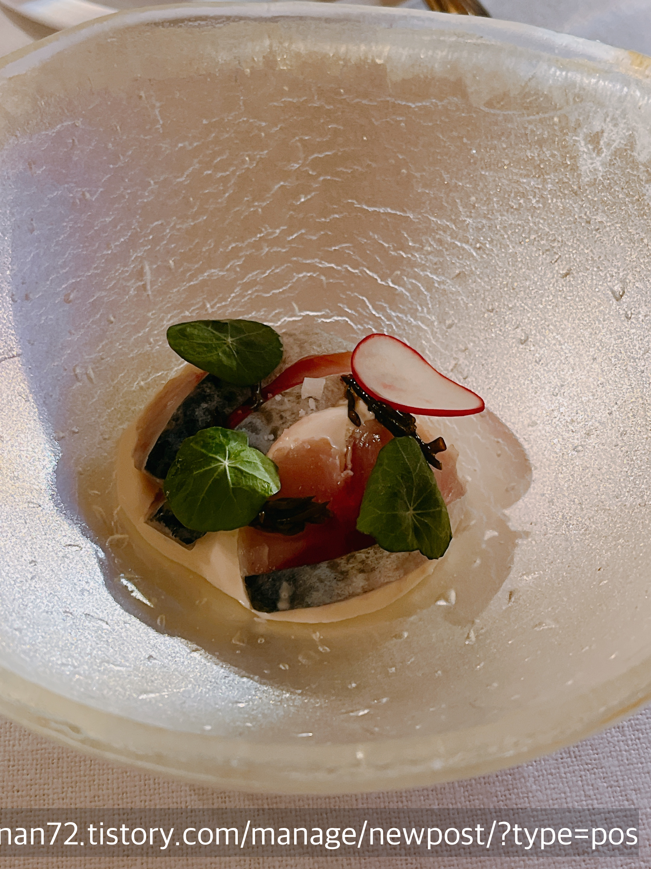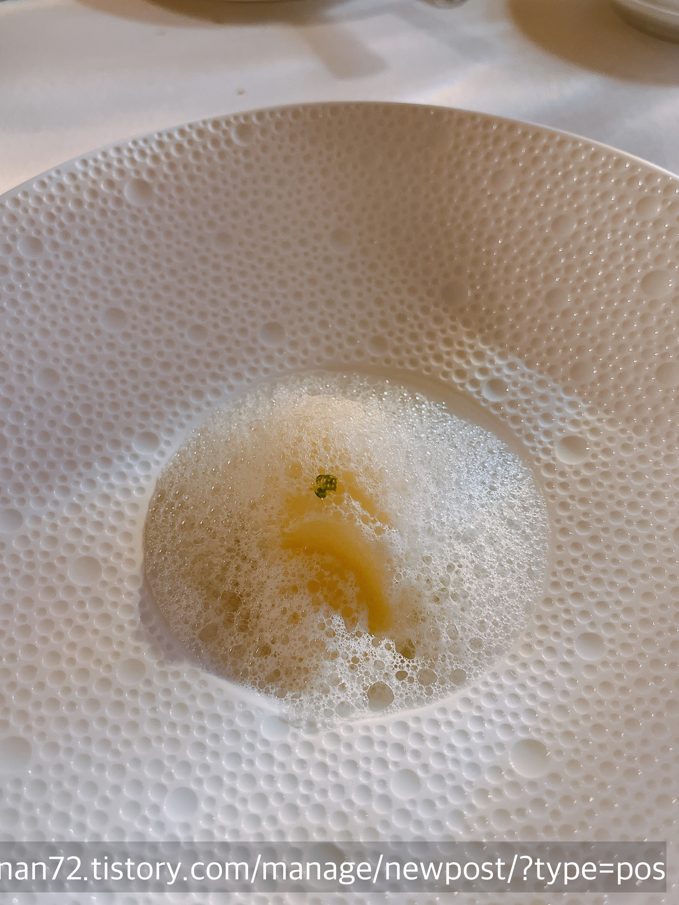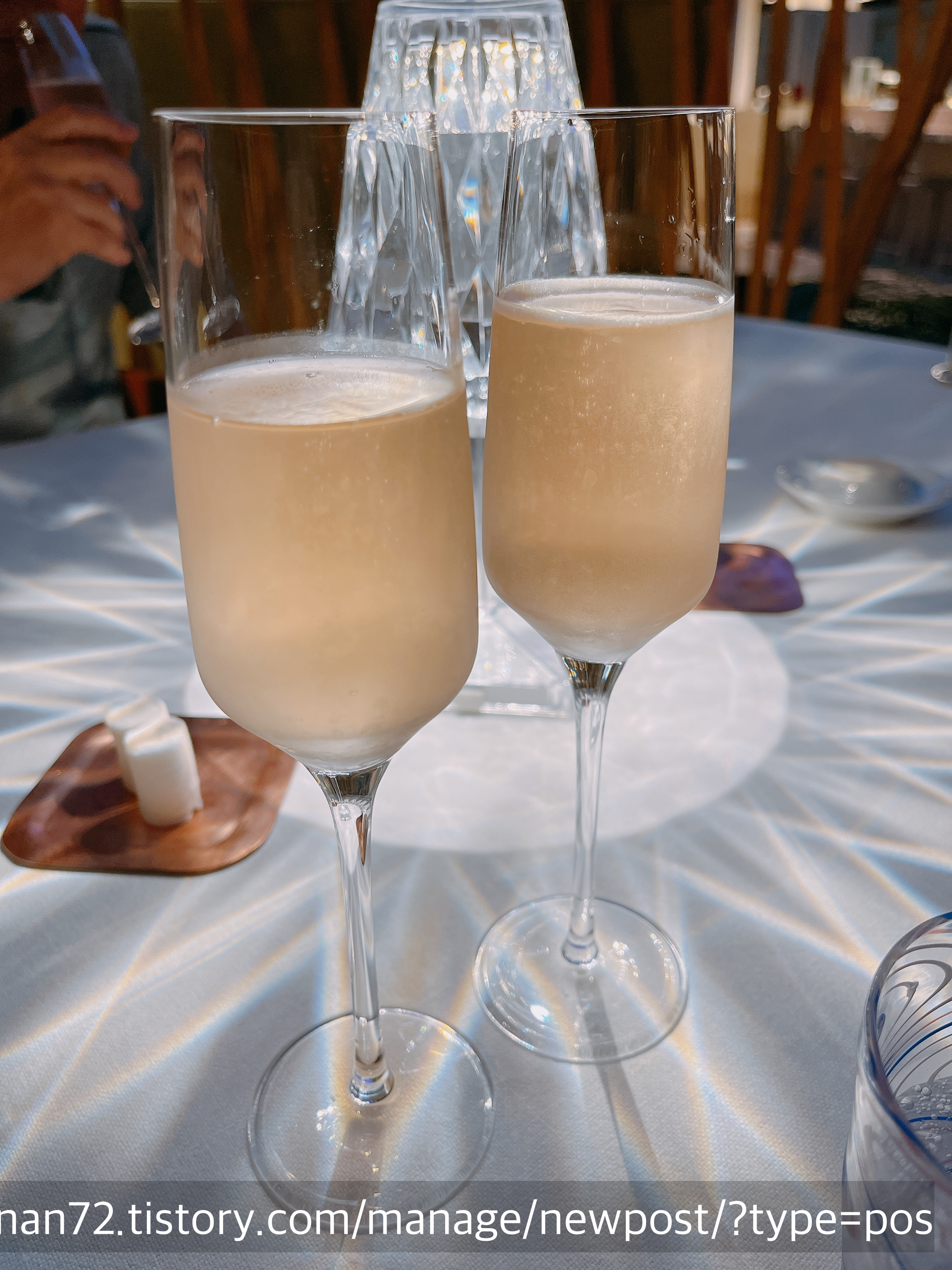1인 한 잔씩 받았는데 제가 전에 찾아보기로는 음식에 맞춰서 3-4종의 와인 페어링을 해준다...라고 본 것 같아서 직원분께 문의해 보니 따로 추가요금이 발생한다고 하더라구요. 나중에 찾아보니 예전에는 시그니쳐 메뉴에 포함되어 있었지만 지금은 별도로 분리된 것 같다는 글을 찾고 그렇구나 했어요. 하긴 제가 처음에 찾아본 영상이 꽤 예전 거였으니.