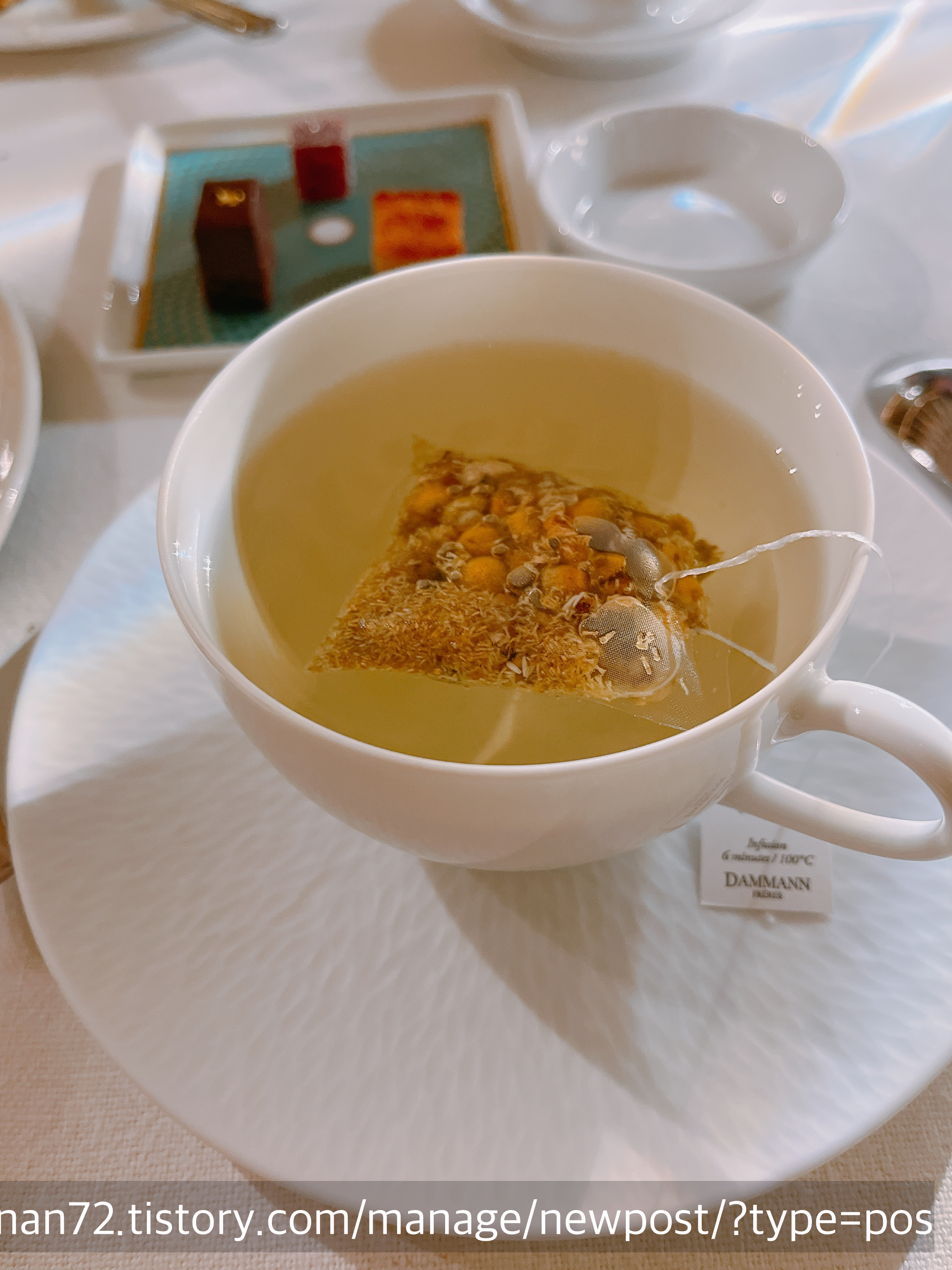 티푸드와 캐모마일 티. 음료는 고를 수 있는데 커피, 홍차, 허브티가 있고 허브티 3가지 중에서도 또 고를 수 있는데 저희 셋은 캐모마일로 통일했답니다. 티푸드는 라즈베리 젤리, 그리고 콩테 치즈 뭐라고 하셨는데 정확히는 기억나지 않네요... 프랑스 요리 너무 어렵다...