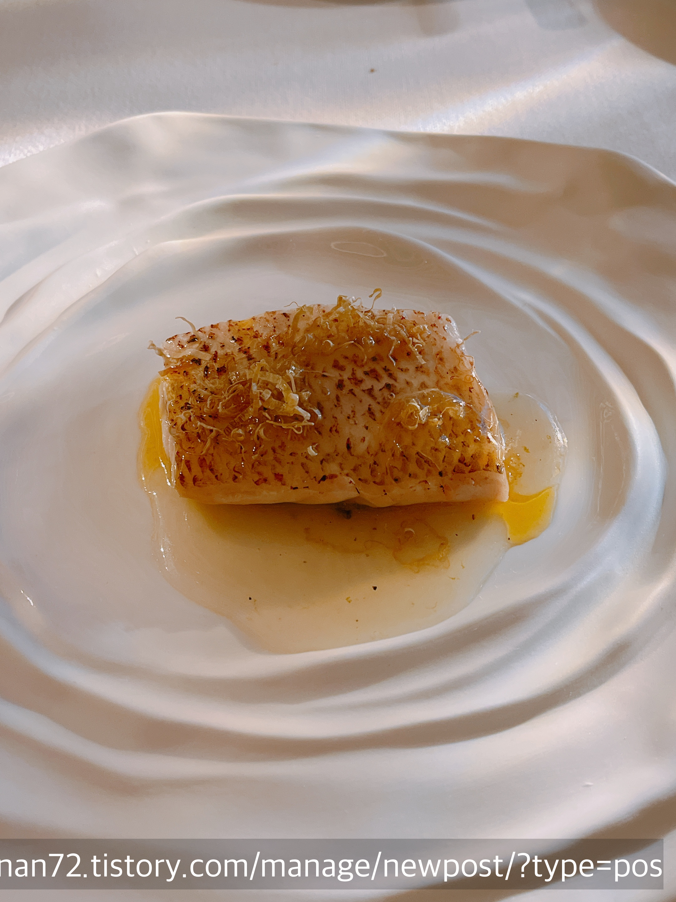 금태요리. 튀긴 백버섯을 찐 금태 생선살 위에 올리고 살 아래에는 목이버섯을 깔아놓은 요리. 그리고 청귤에센스 소스를 뿌려서 마무리.