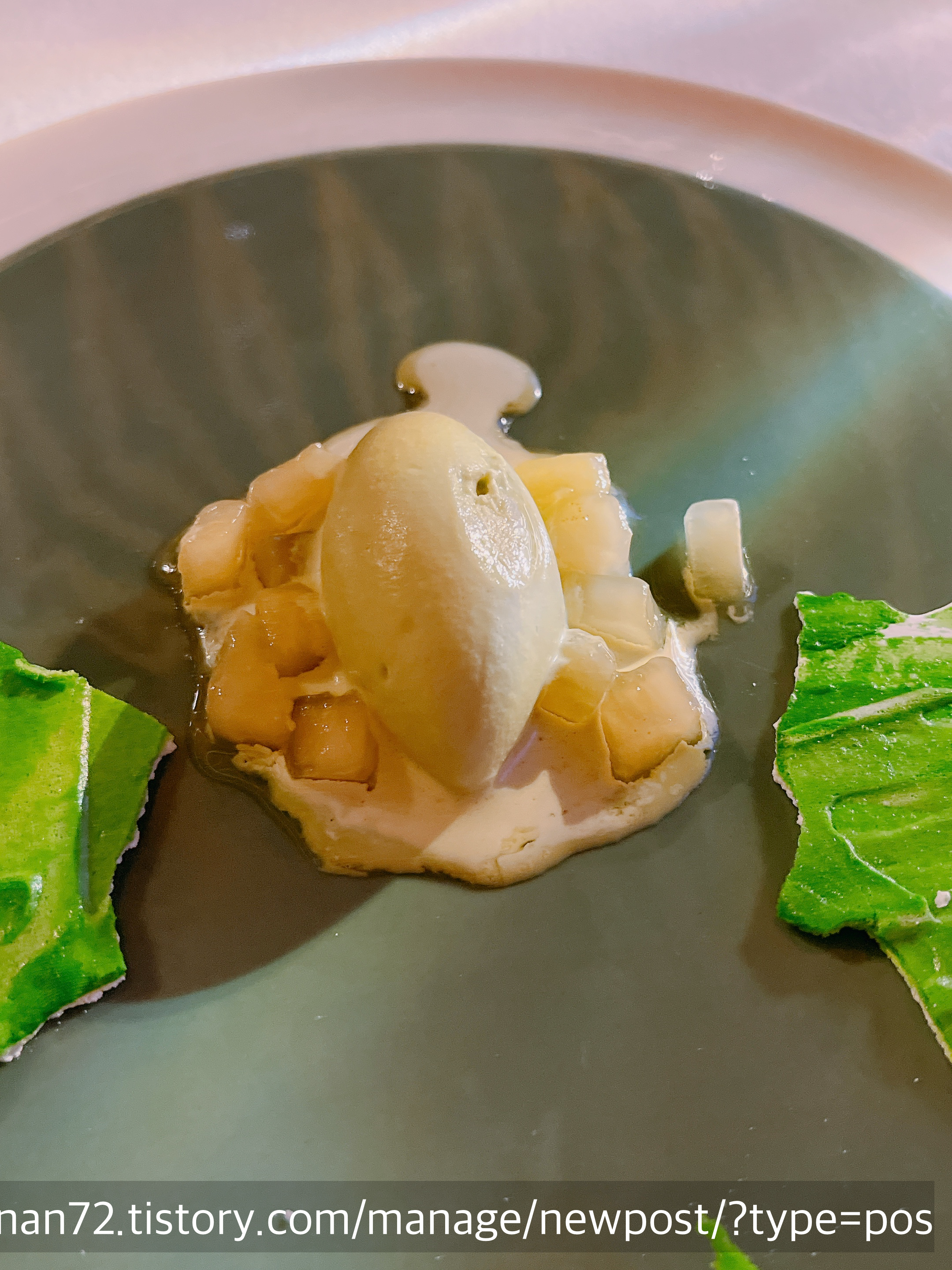 디저트로 나온 청포도&청귤 소르베. 위의 거품은 레몬거품이라고 하네요. 상큼해서 앞에 먹었던 요리들의 맛을 말끔하게 씻어주는 느낌을 받았어요. 앞의 요리들이 생선이랑 고기류라 맛있게 먹은 거랑 별개로 혀가 좀 무거웠는데 식후 디저트 역할을 톡톡히 했네요.