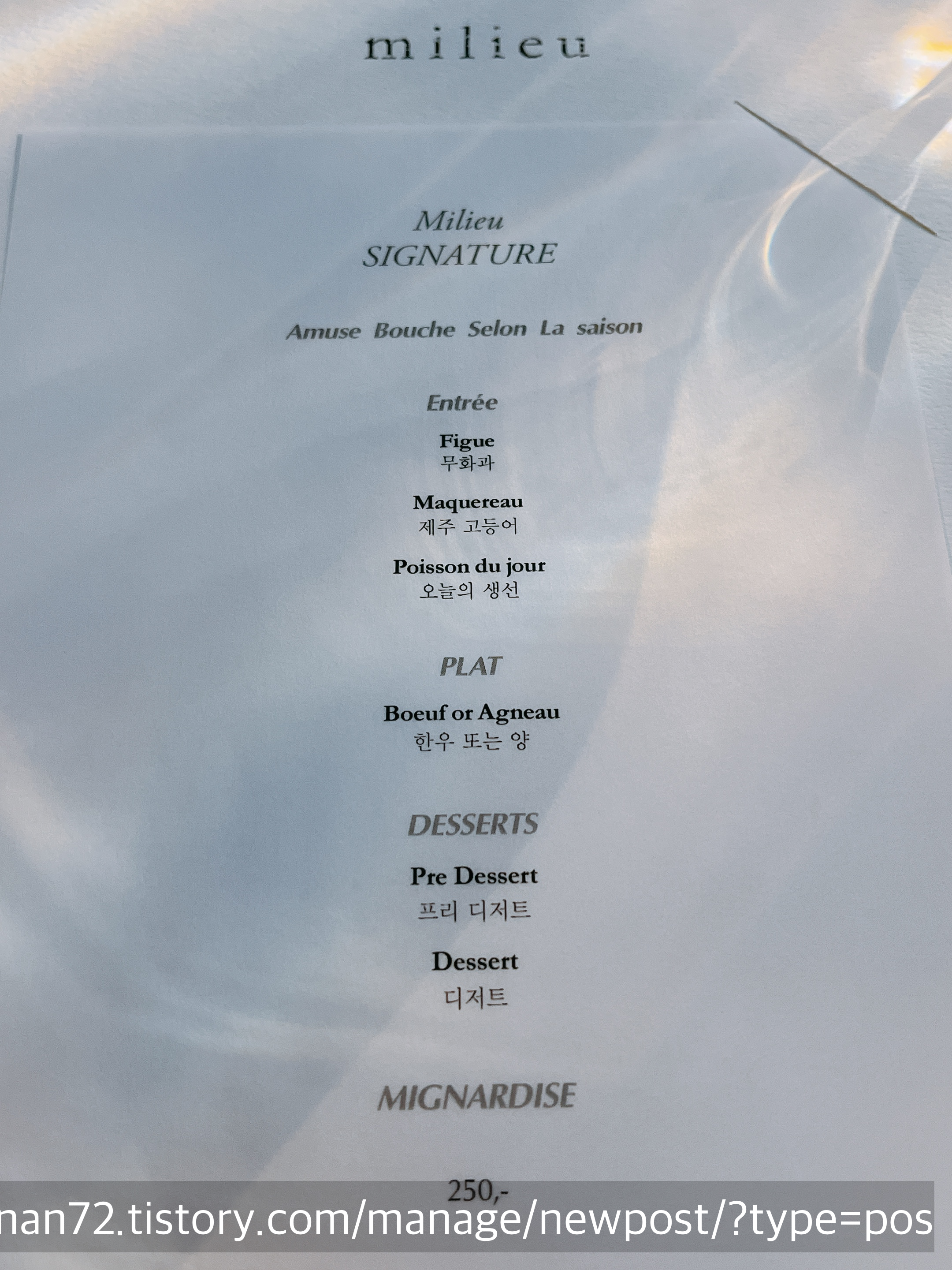사실 전 프랑스요리는 잘 몰라서 아예 종이에 설명이 자세히 써져 있었으면 했는데 그건 아니라 조금 아쉬웠어요. 메뉴 하나씩 나올 때마다 직원분들이 자세히 친절하게 설명해 주셨지만 말로 듣는 거랑 눈으로 보는 거랑은 또 달라서...ㅠㅠㅋㅋㅋ