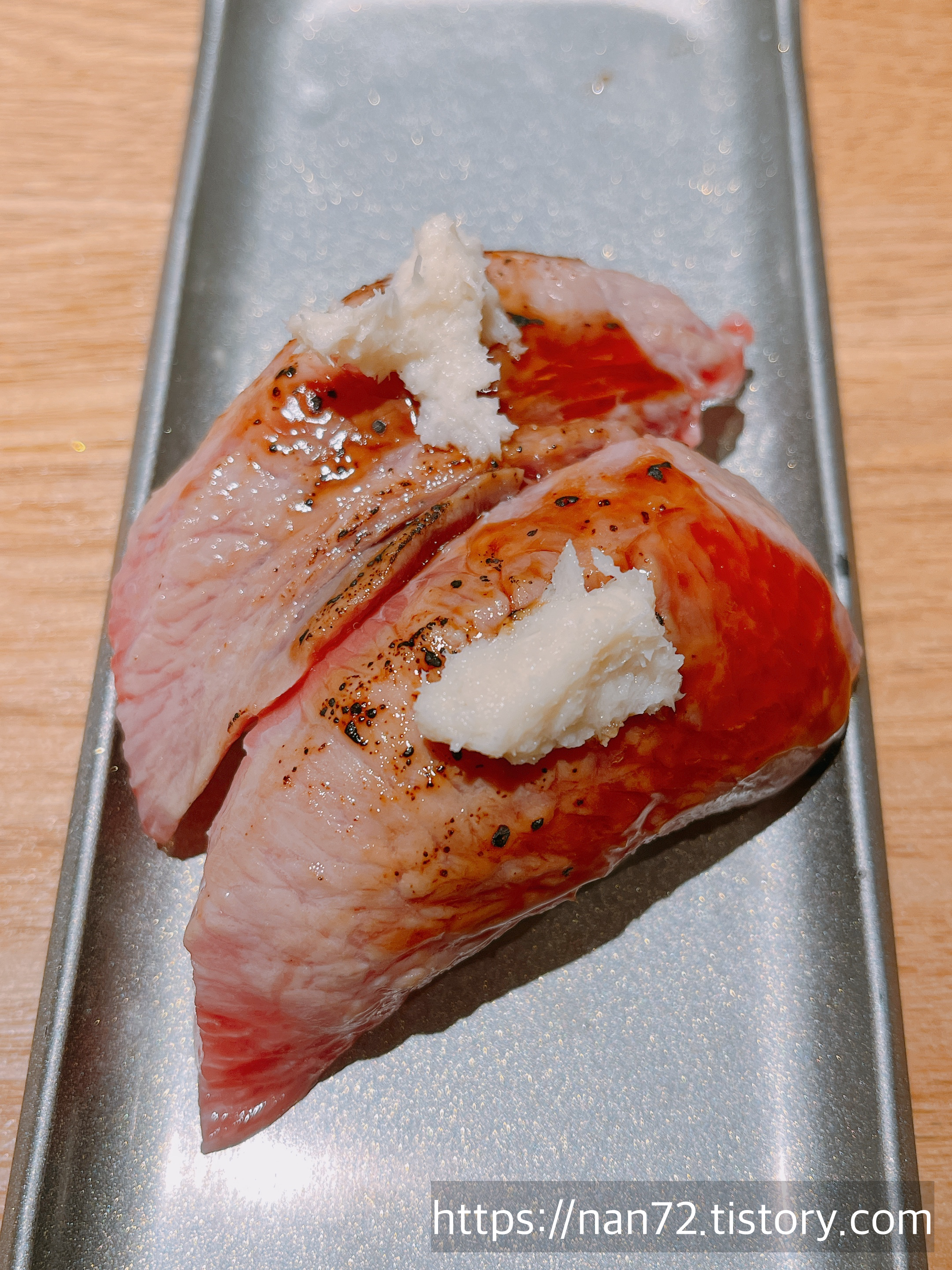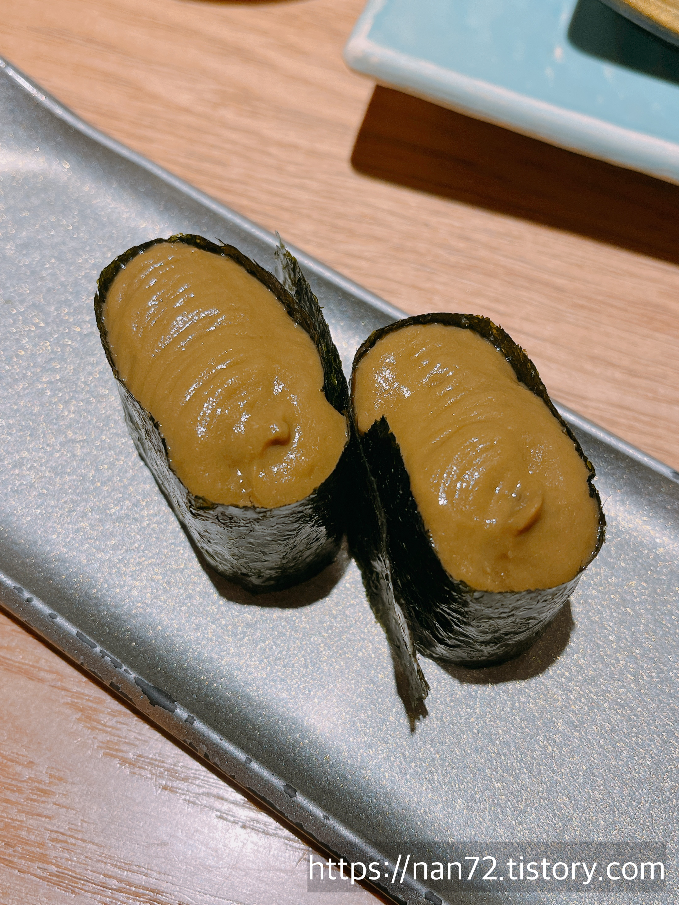 제가 사랑해 마지않는 카니미소(게장미소) 초밥. 진짜 이 깊은 바다맛을 너무 사랑해서 이것만 두 접시를 주문해서 먹었어요. 진짜 완전 좋아. 친구는 제가 이걸 이렇게 좋아하는 걸 보면서 놀라더라구요ㅋㅋㅋ