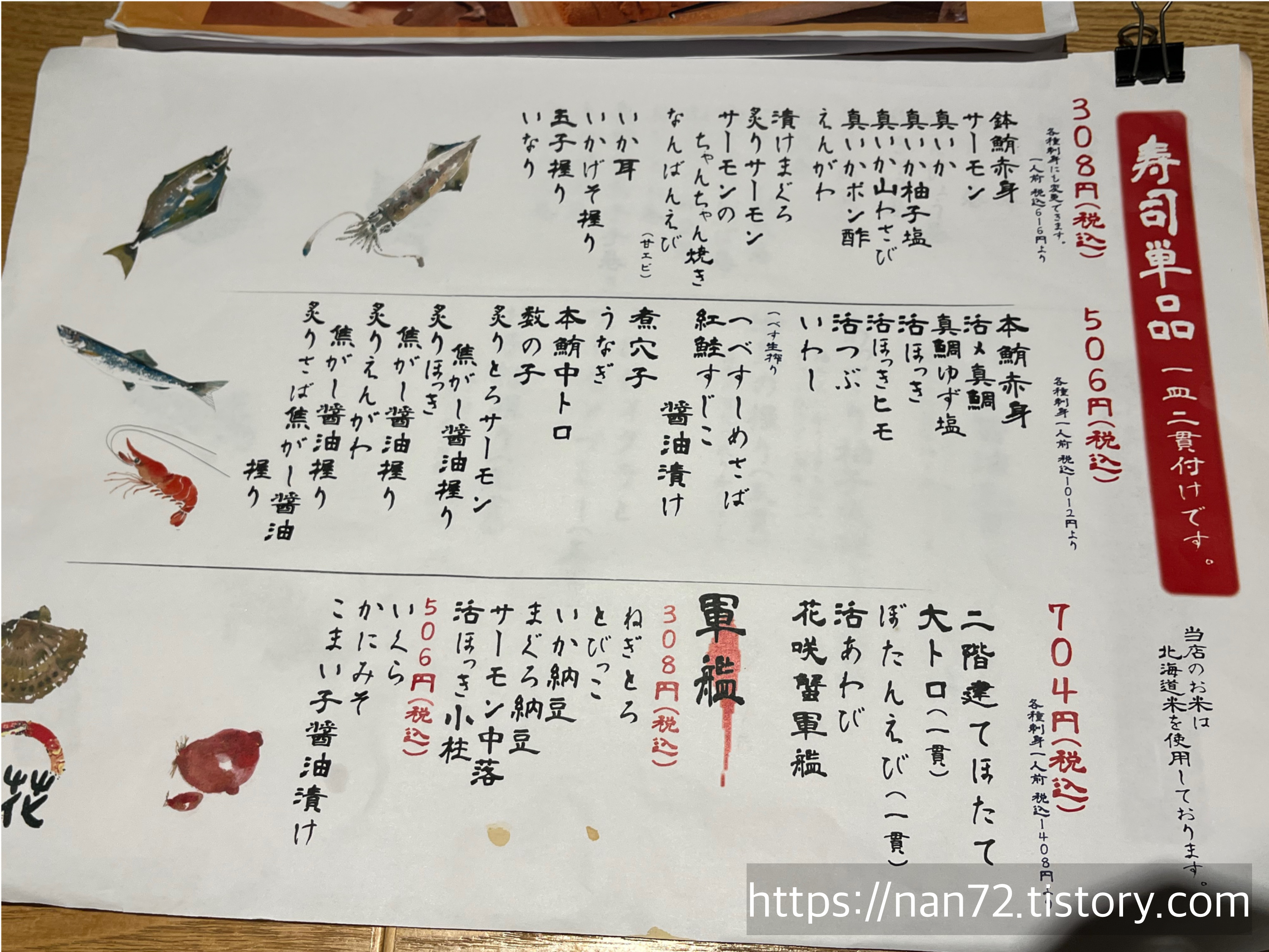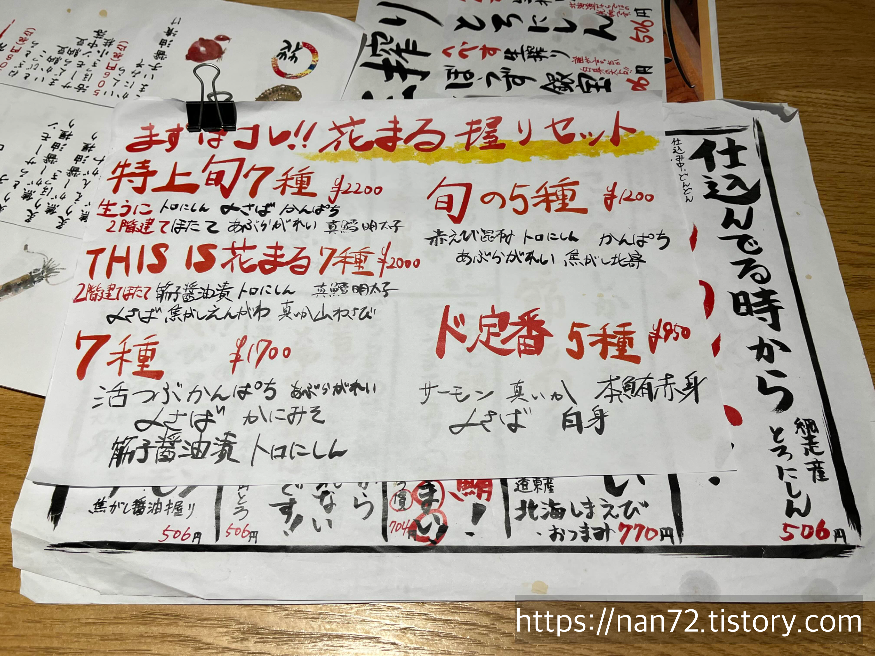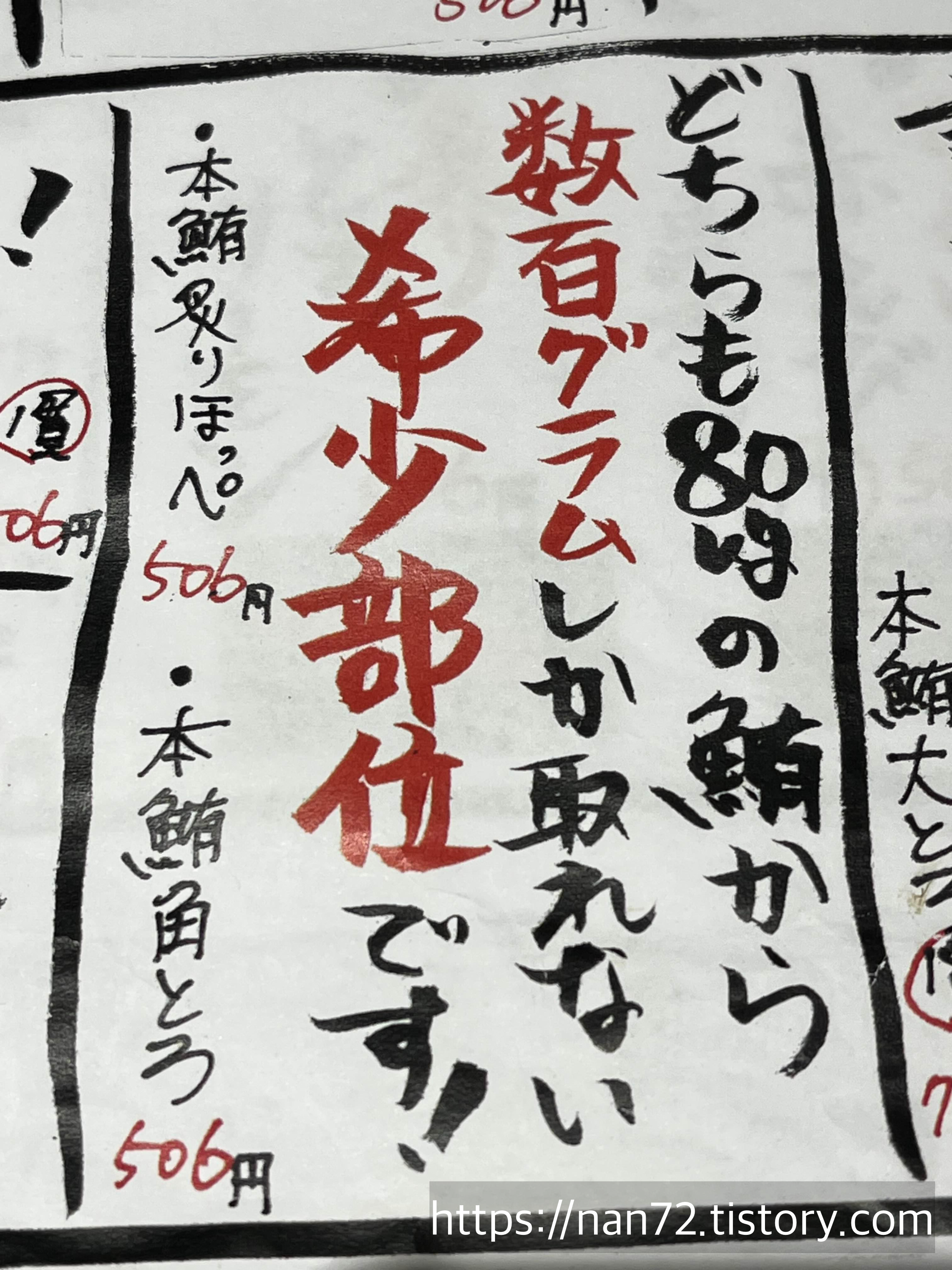 메뉴판입니다. 다 손글씨라 관광객은 보기 좀 힘들 것 같단 생각이 들었어요. 보통 어플번역기 돌린다 해도 손글씨는 잘 인식 못 하는 것 같아서. 그리고 주문할 때도 주문서에 직접 초밥이름을 적어서 줘야 되는 점도 허들이 좀 높다는 생각이 들었네요. 진짜 현지인 맛집이라고 느낀 부분.