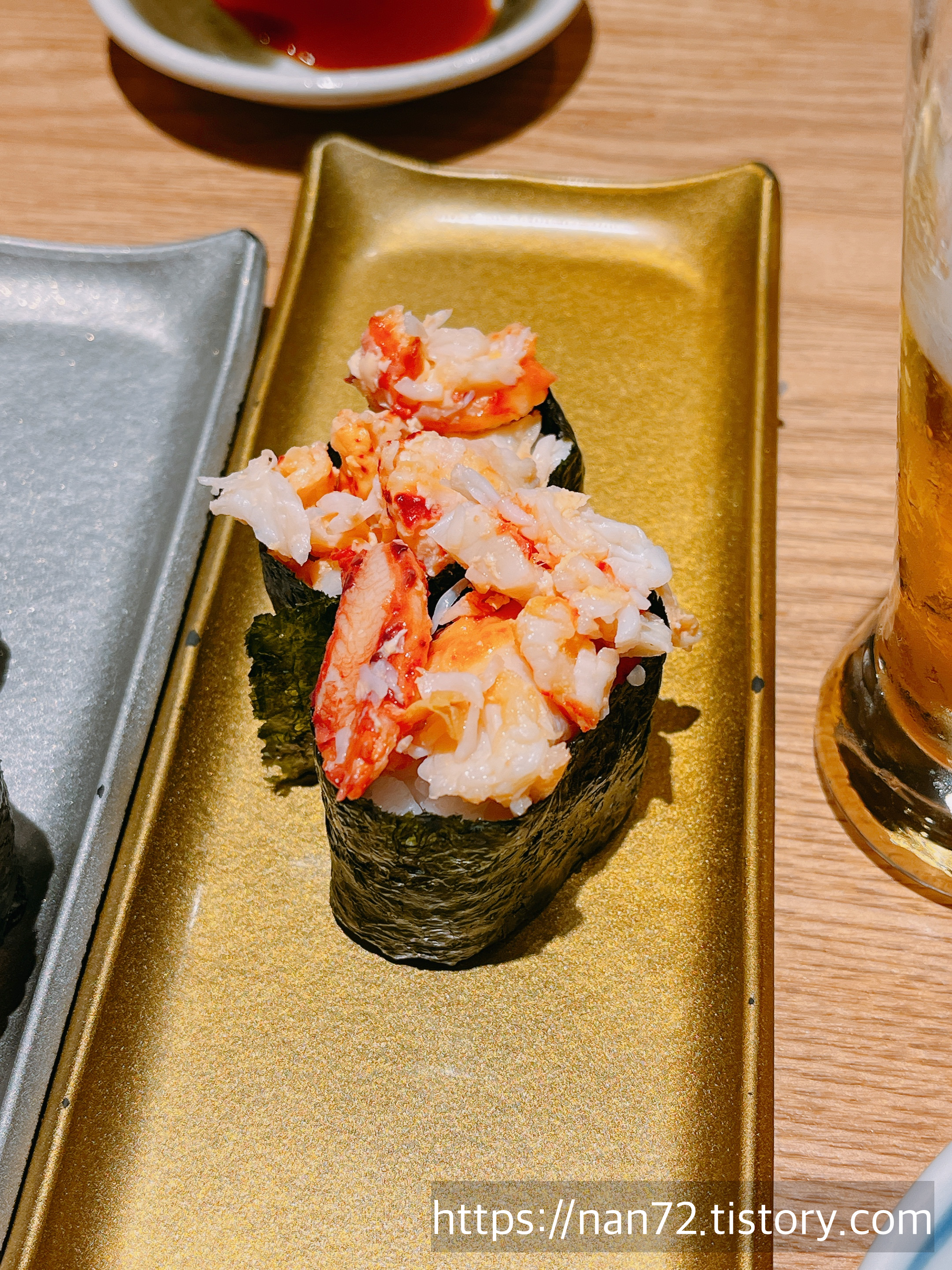 아 이건 제가 따로 주문한 게살초밥이었는데 아마 가장 기대했던 거지만 생각했던 식감이 아니라 조금 실망했던 기억이 납니다. 맛이 없는 건 아닌데 기대가 너무 컸어요. 다른 초밥은 완전 만족했습니다.