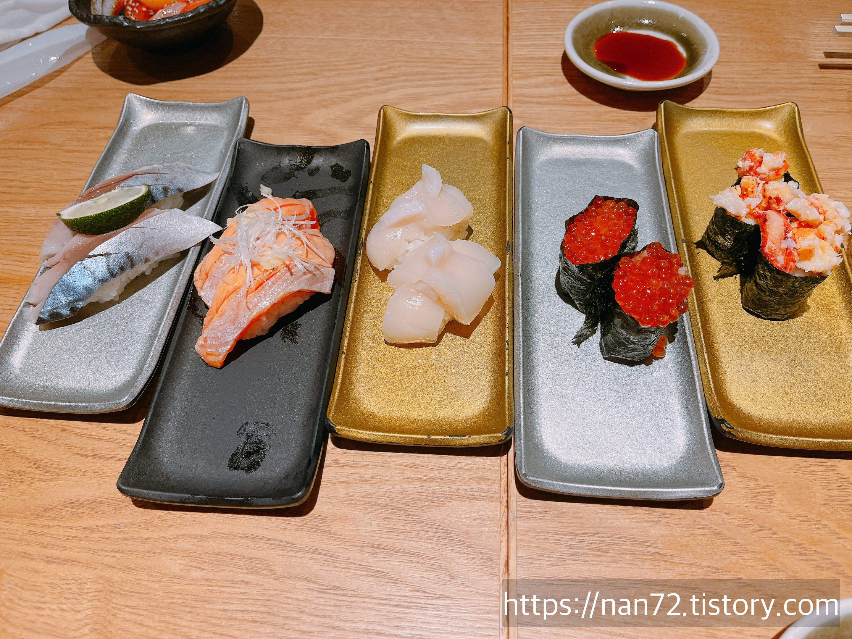 요건 친구가 주문한 개별 초밥. 접시색에 따라 가격이 달라요. 금색이 제일 비싼 거.