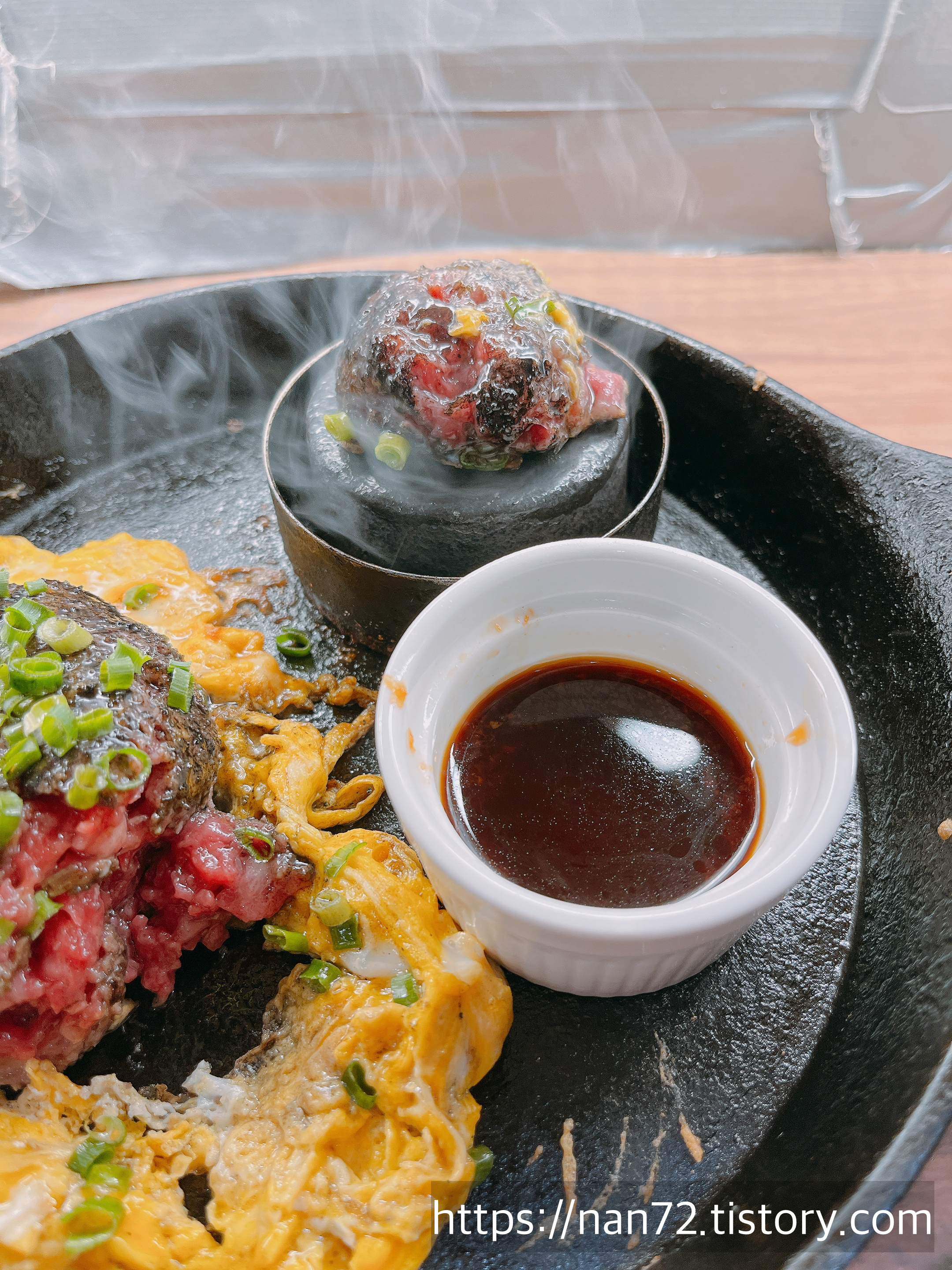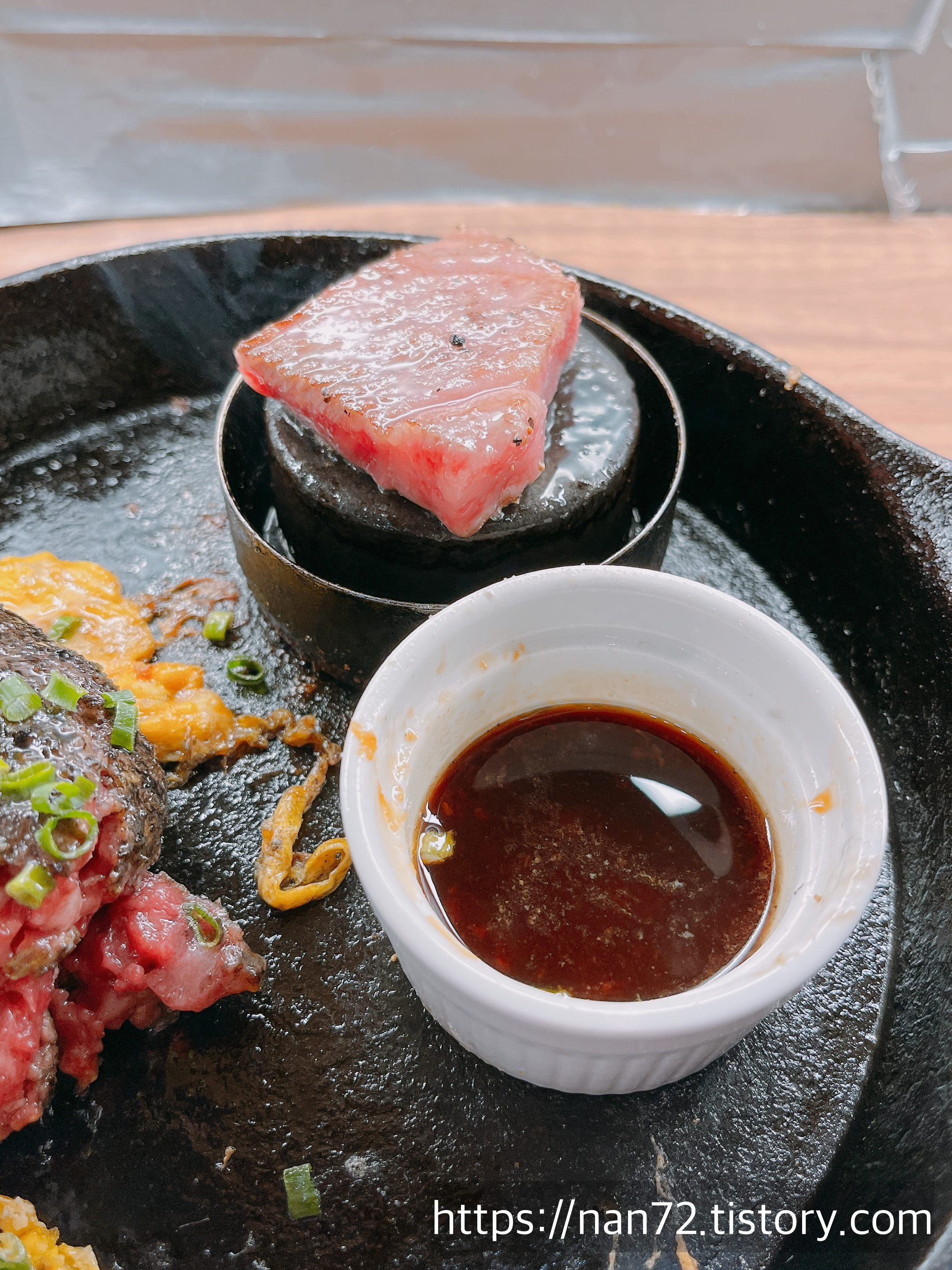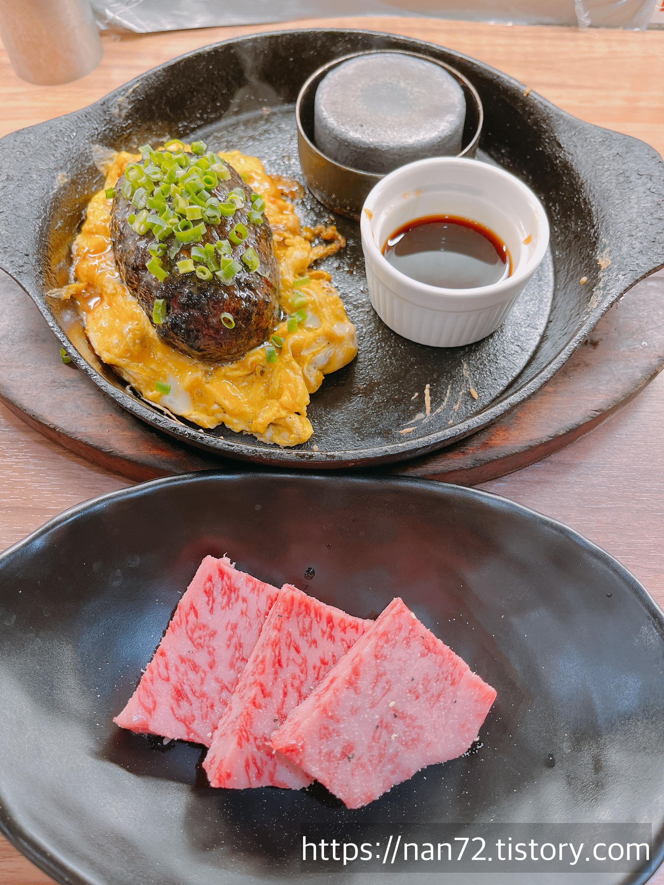 함바그를 저렇게 갈라 보면 덜 익어 있는데 이걸 저 동그란 돌 위에 올려서 구워 먹는 시스템이에요. 돌이 뜨거워서 재료를 올리면 바로 치이익 소리가 나면서 익거든요. 근데 보시는 대로 너무 작아서 많이 올릴 수도 없을뿐더러 생각보다 빨리 식어서 자주 갈아줘야 되는 게 불편했어요. 직원분께 갈아달라 하면 바로바로 갈아주시기는 하지만… 먹기 번거로운 건 어쩔 수 없더라구요. 아 함바그 맛은 좋았어요.