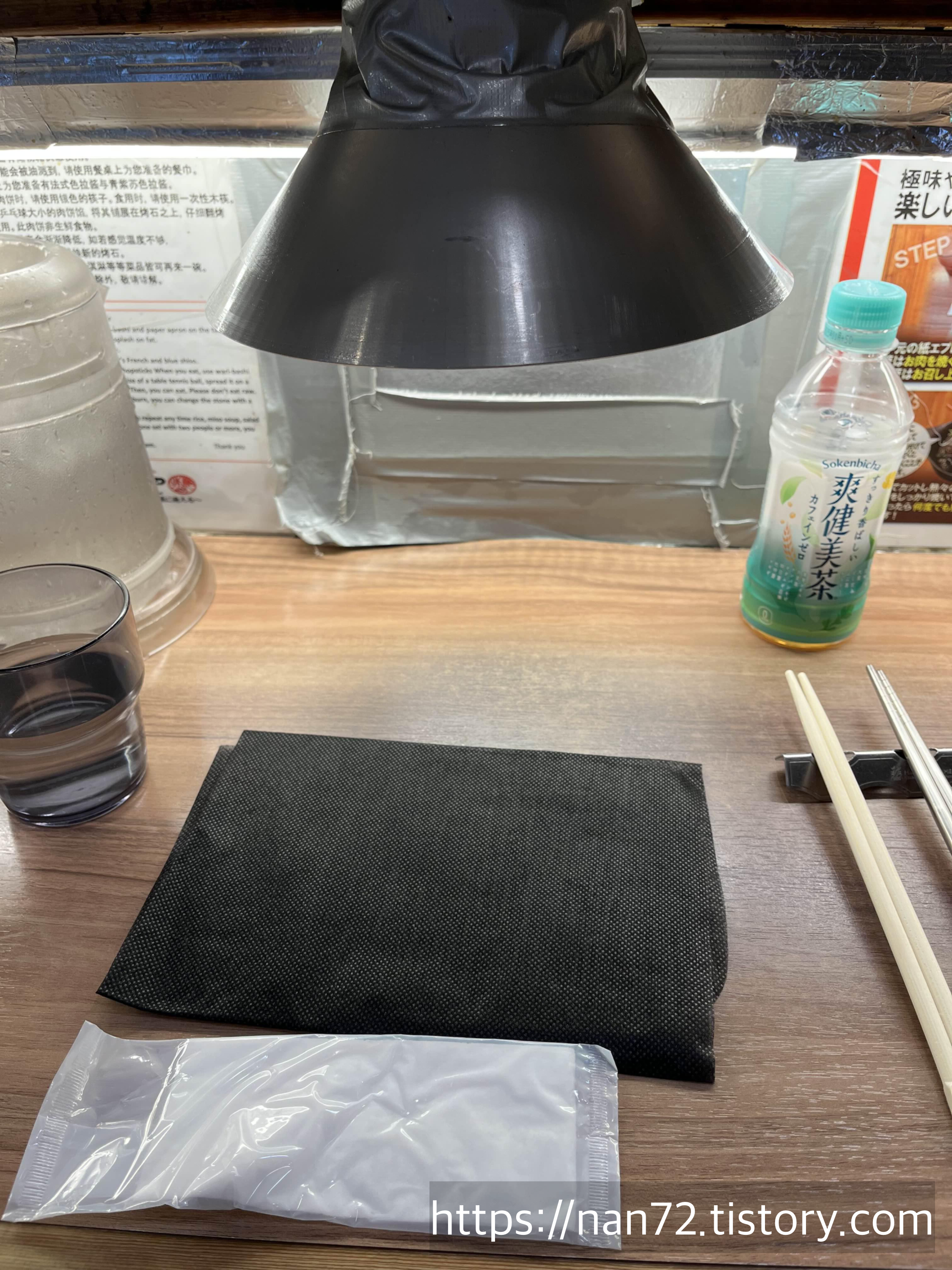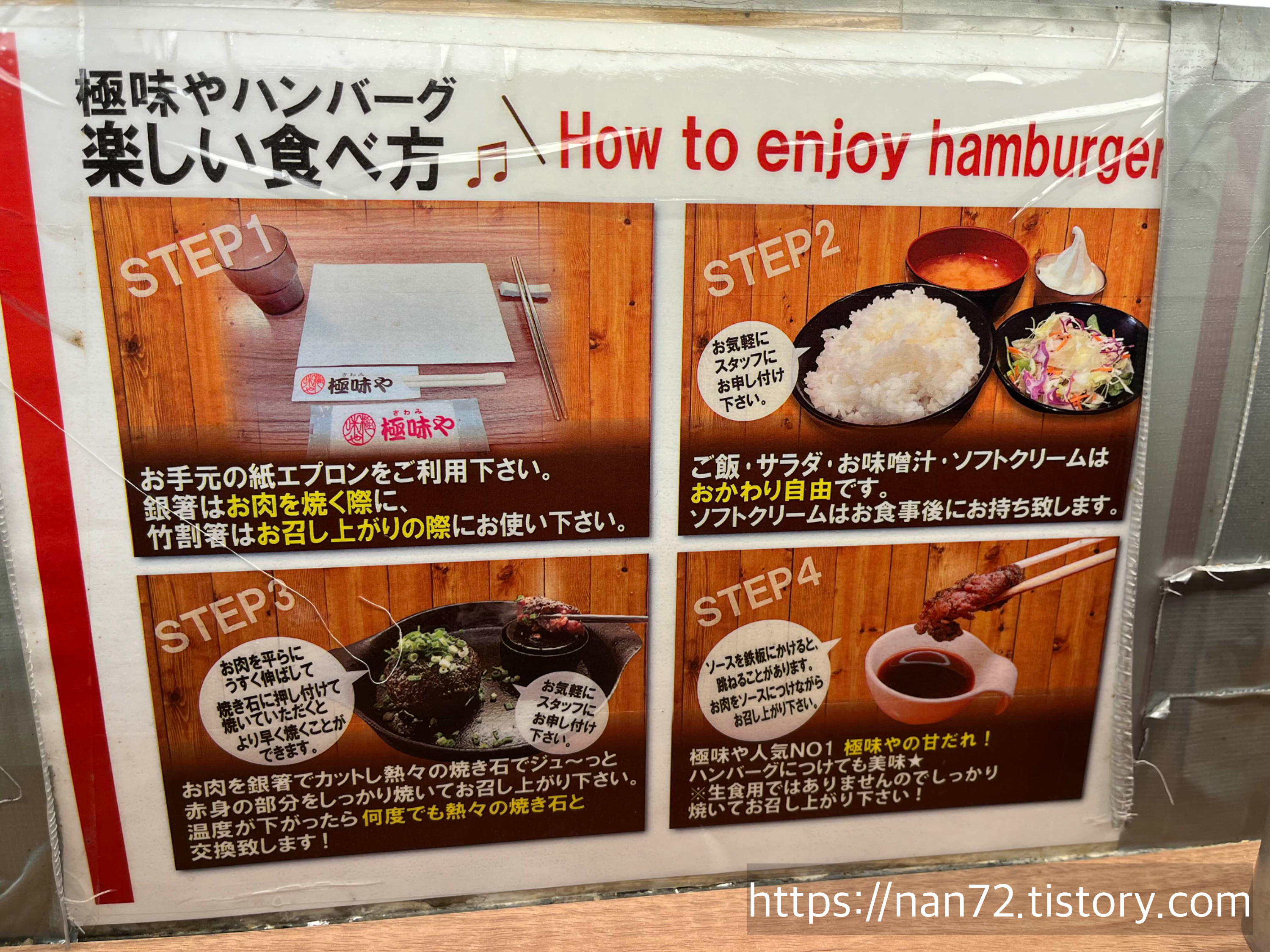 가게가 굉장히 협소해서 옆사람이랑 거의 따닥따닥 붙어 앉는 느낌으로 좌석이 배치되어 있어요. 쾌적함 부분에선 애매할 수 있겠네요. 아무튼 가게 들어와서 앉으면 앞에 이렇게 되어 있습니다. 물이랑 젓가락 등 기본적으로 되어 있는 세팅에 함바그 먹는 방법이 그림으로 설명되어 있는 안내판까지.