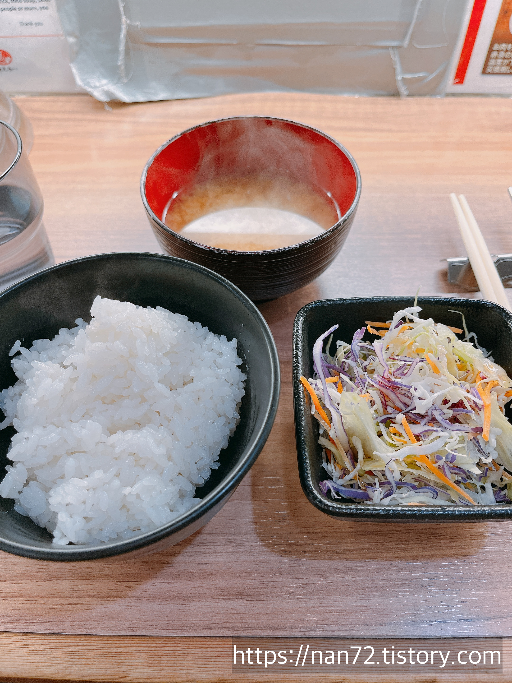 먼저 사이드 세트부터 나와요. 밥, 샐러드, 국. 요건 다 리필 가능합니다. 직원분께 말씀드리면 바로바로 해주세요.