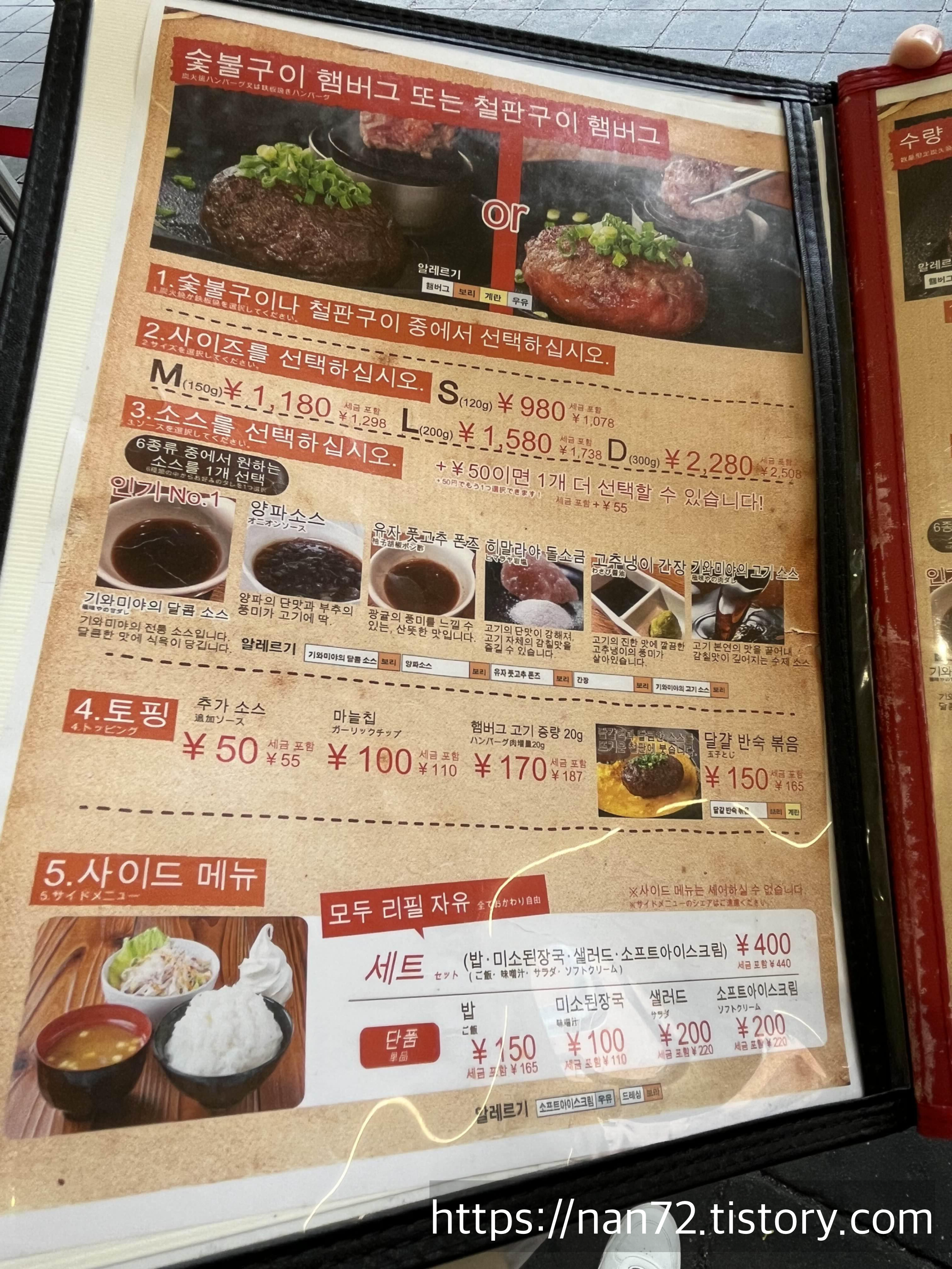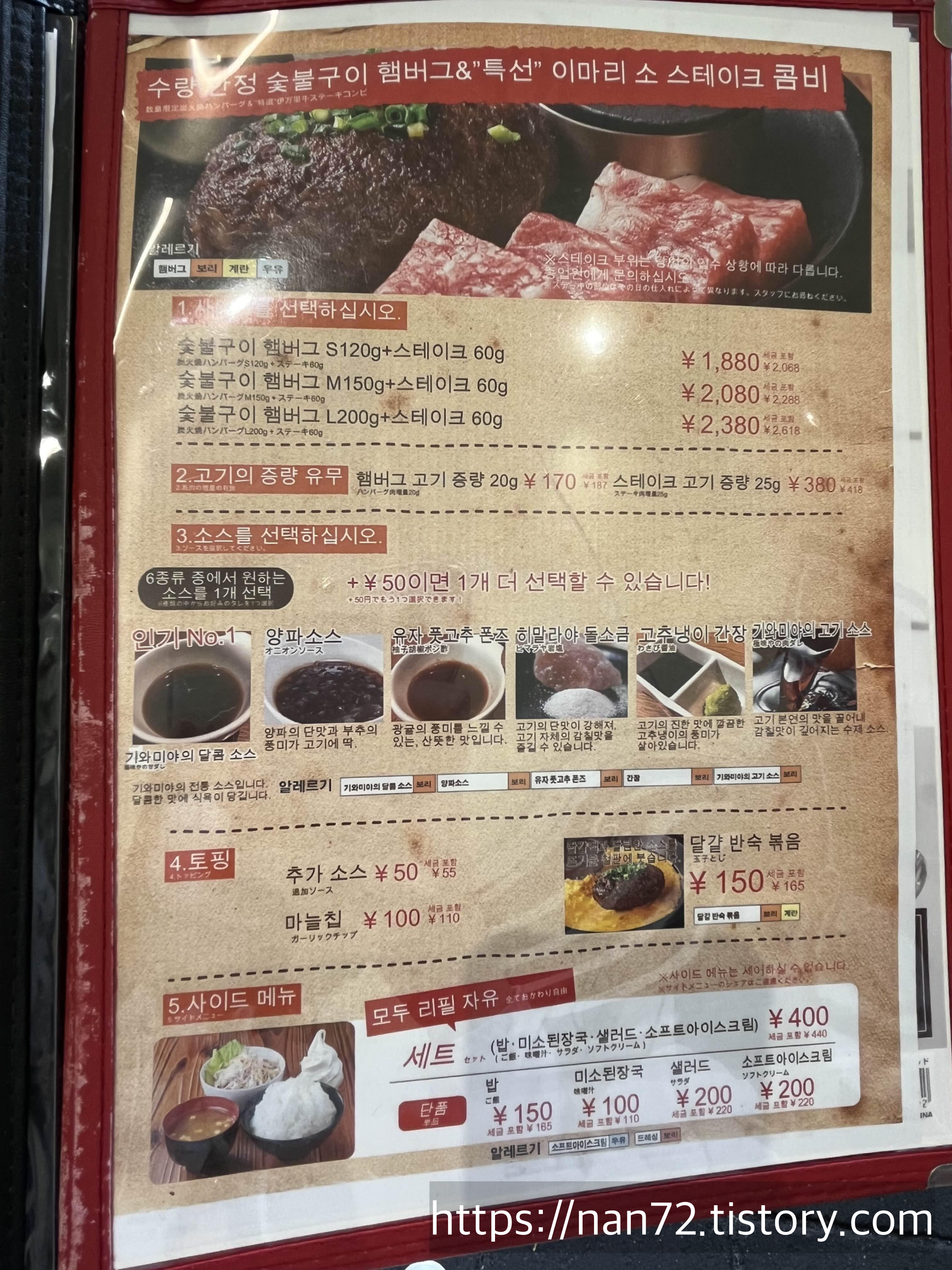 아, 가게 들어가기에 앞서 미리 주문을 받더라구요. 줄 서 있는데 직원분이 메뉴판을 나눠주셔서 봐보니 한글로 써져 있는 메뉴판. 그만큼 한국인들이 많이 찾는 가게라는 거겠죠. 직원분도 간단한 한국어는 할 줄 아시는 것 같았어요. 저는 <숯불구이 햄버그 S &이마리 소 스테이크>를 주문하고 달걀 반숙, 사이드 메뉴 추가해서 주문했어요.