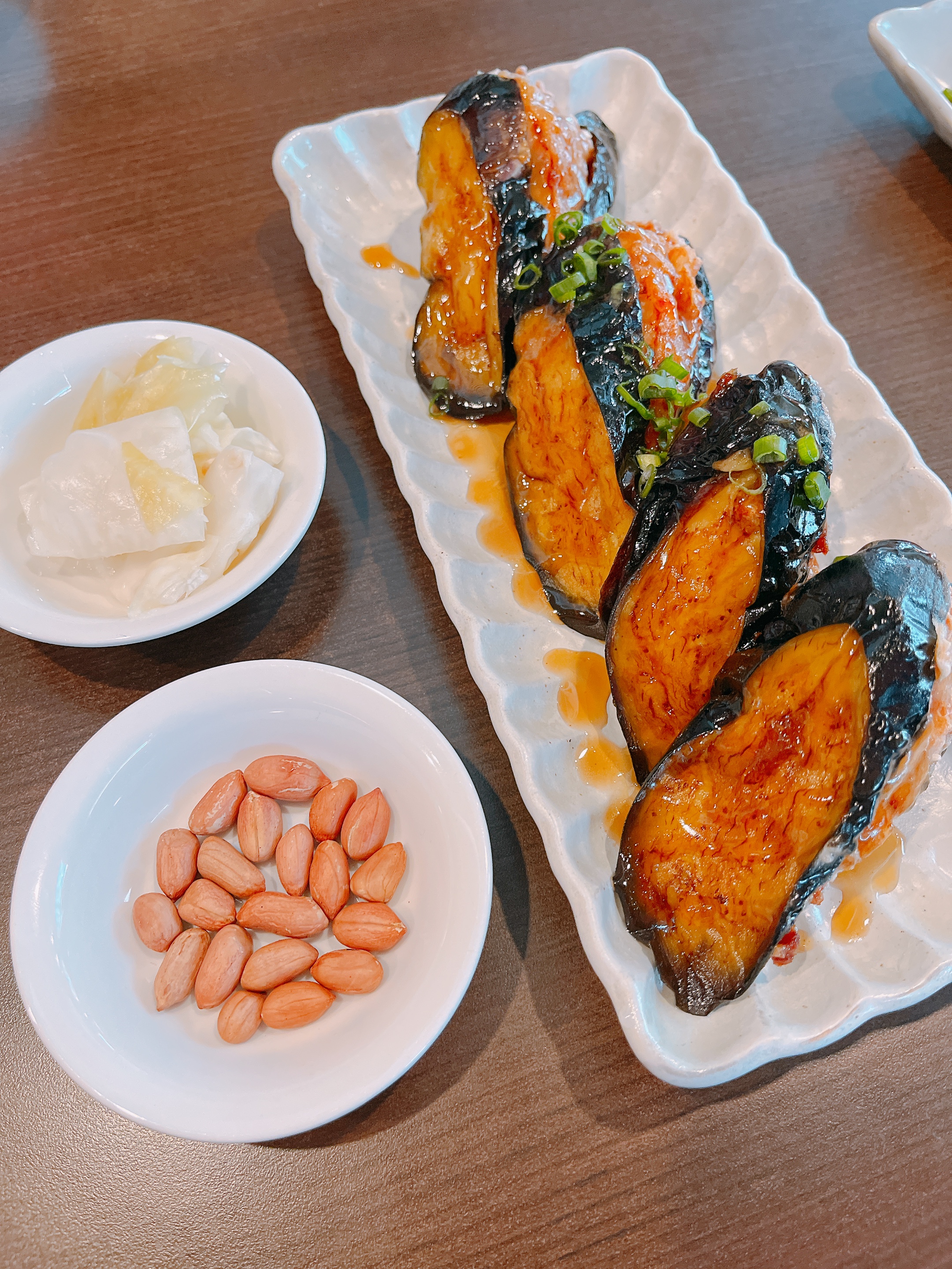 가지에 새우와 돼지고기를 넣고 튀겨 데리야끼 소스로 맛을 낸 딤섬. 기본 3피스에 하나 더 추가했어요.