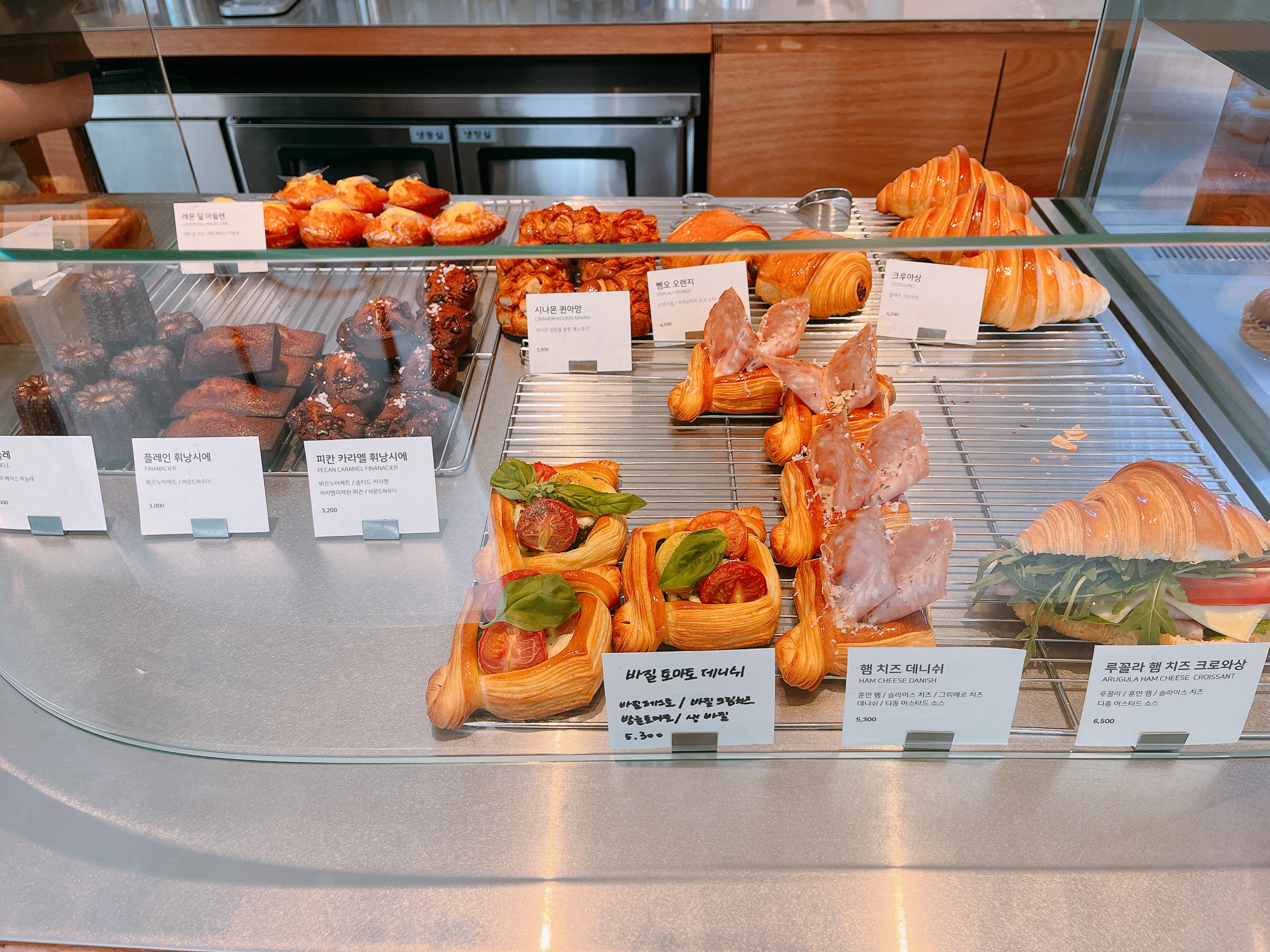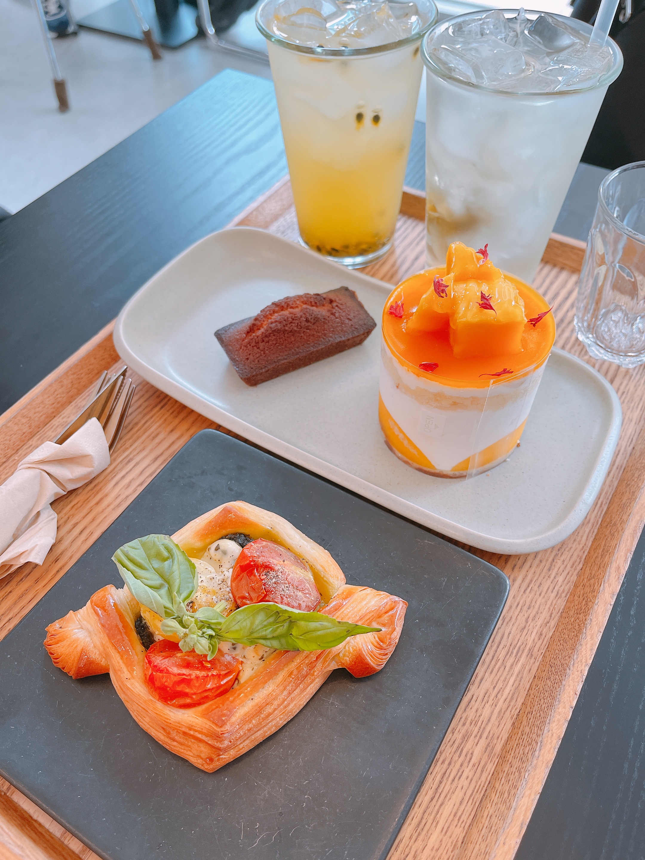 저희는 이렇게 주문했어요. 지인이 망고 패션, 저는 바질토마토 데니쉬. 쁘띠갸또도 땡겼지만 전에 먹었으니 이번엔 다른 걸 먹어보자! 해서 데니쉬를 골랐네요. 데니쉬 때깔이 너무 좋아 보여서 안 고를 수가 없었어요.