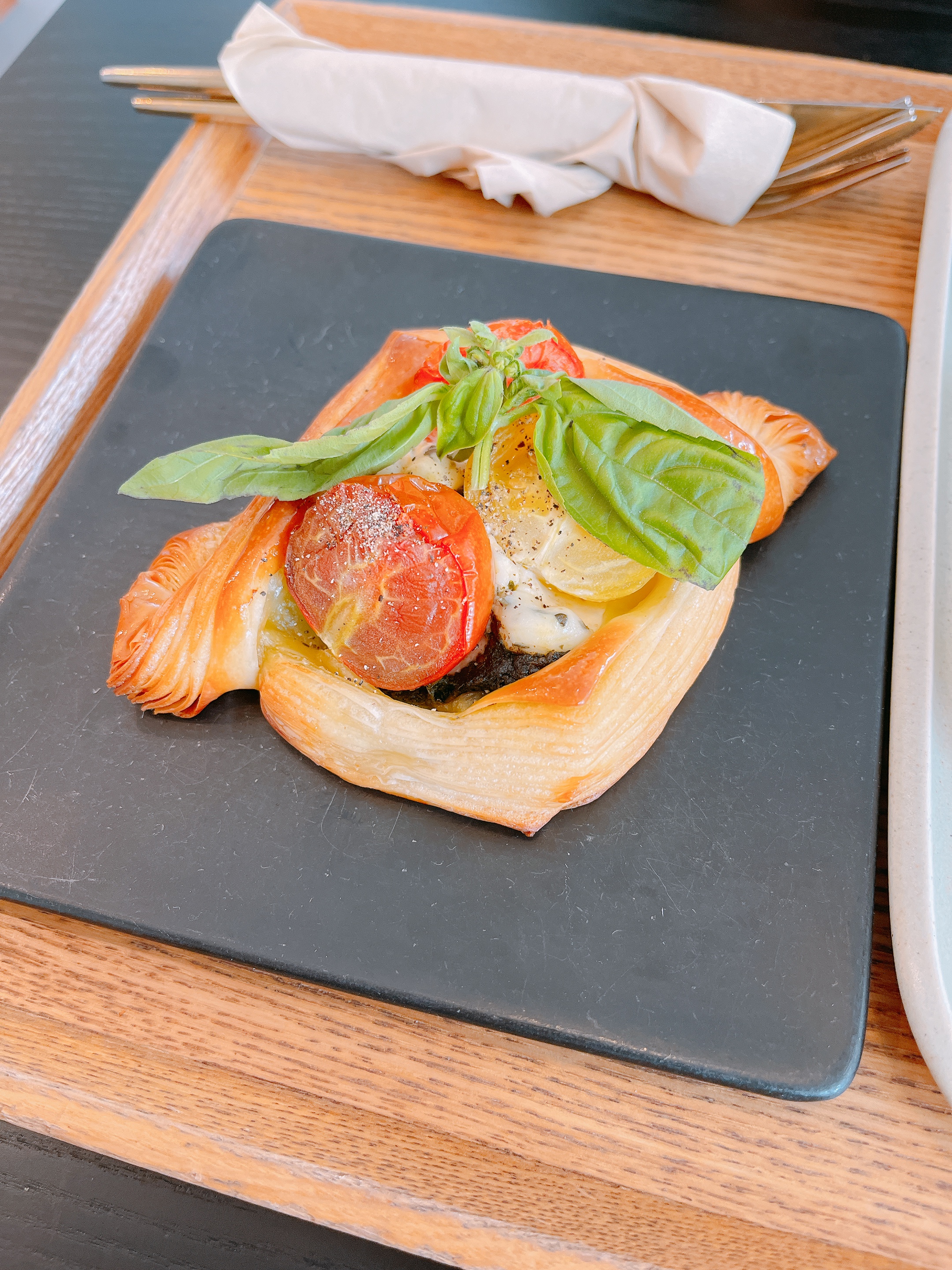데니쉬 빵이 바삭하고 풍미가 정말 깊어요. 그리고 좋은 토마토와 바질이 함께 어우러져서 너무 맛있었어요. 바질이 많이 들어 있는데 그래서 그런지 한국인들이 좋아할 수밖에 없다는 생각이 문득 들었네요.