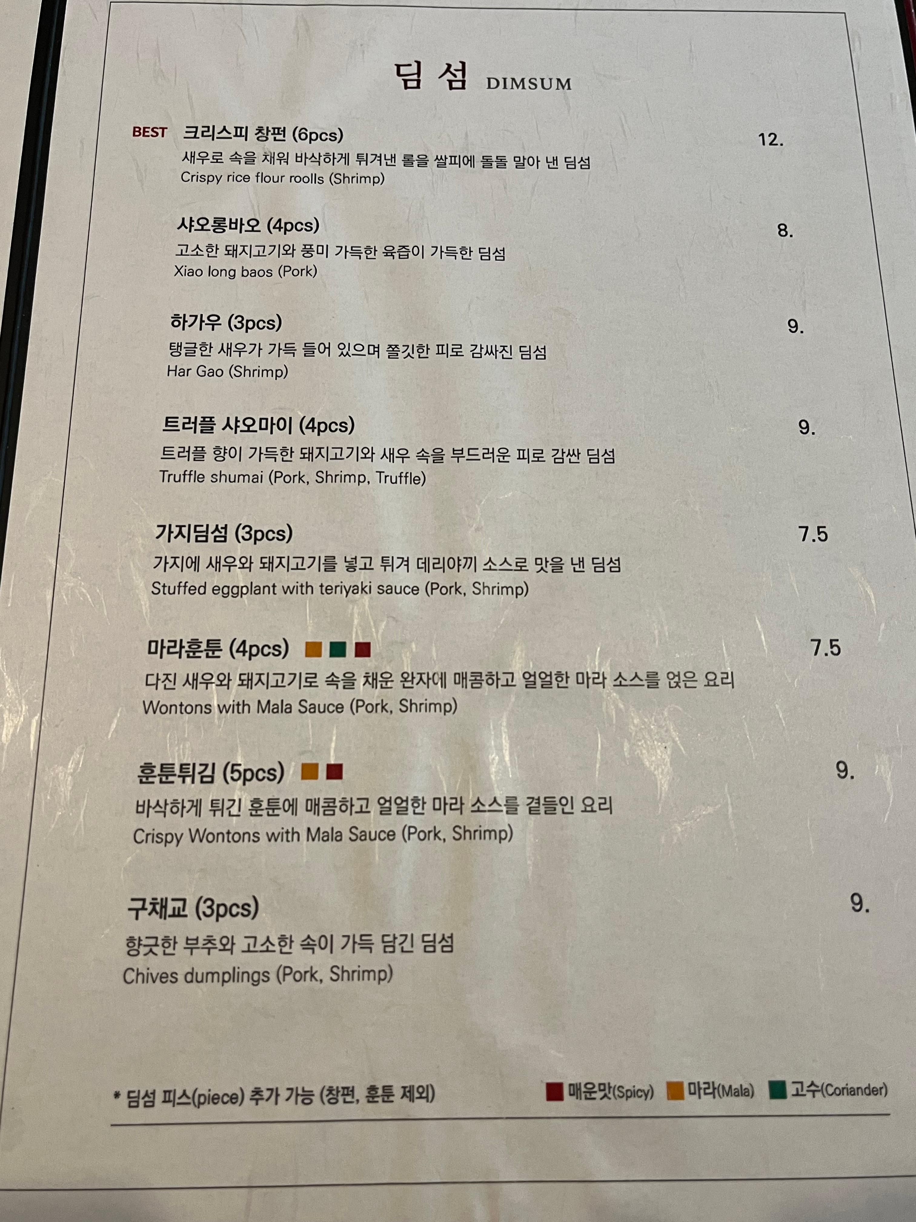 메뉴판 일부. 이것저것 많았지만 저희는 딤섬 먹으러 온 거라 딤섬 3가지 주문했어요.